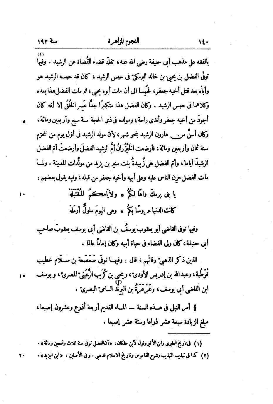 بالفقه على مذهب أبي حنيفة رضي الله عنه، تقلد قضاء القضاة عن الرشيد. وفيها «1» توفي الفضل بن يحيى بن خالد البرمكي في حبس الرشيد، كان قد حبسه الرشيد هو وأباه بعد قتل أخيه جعفر، فحبسا إلى أن مات أبوه يحيى، ثم مات الفضل هذا بعده وكلاهما في حبس الرشيد. وكان الفضل هذا متكبراً جداً عسر الخلق إلا أنه كان أجود من أخيه جعفر وأندى راحة؛ ومولده في ذي الحجة سنة سبع وأربعين ومائة، وكان أسن من هارون الرشيد بنحو شهر، لأن مولد الرشيد في أول يوم من المحرم سنة ثمان وأربعين ومائة، فأرضعت الخيزران أم الرشيد الفضل وأرضعت أم الفضل الرشيد أياماً، وأم الفضل هي زبيدة بنت منير بن يزيد من مولدات المدينة. ولما مات الفضل حزن الناس عليه وعلى أبيه وأخيه جعفر من قبله، وفيه يقول بعضهم: