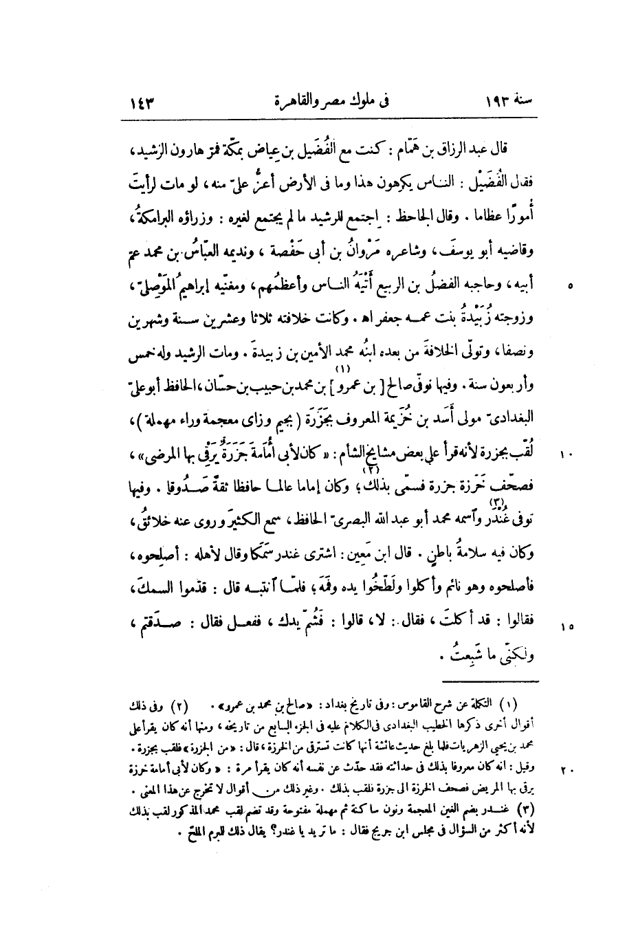 قال عبد الرزاق بن همام: كنت مع الفضيل بن عياض بمكة فمر هارون الرشيد، فقال الفضيل: الناس يكرهون هذا وما في الأرض أعز علي منه، لو مات لرأيت أموراً عظاماً. وقال الجاحظ: اجتمع للرشيد ما لم يجتمع لغيره: وزراؤه البرامكة، وقاضيه أبو يوسف، وشاعره مروان بن أبي حفصة، ونديمه العباس بن محمد عم أبيه، وحاجبه الفضل بن الربيع أتيه الناس وأعظمهم، ومغنيه إبراهيم الموصلىّ، وزوجته زبيدة بنت عمه جعفر اهـ. وكانت خلافته ثلاثاً وعشرين سنة وشهرين ونصفاً، وتولى الخلافة من بعده ابنه محمد الأمين بن زبيدة. ومات الرشيد وله خمس وأربعون سنة. وفيها نوفّى صالح [بن عمرو «1» ] بن محمد بن حبيب بن حسان، الحافظ أبو علي البغدادي مولى أسد بن خزيمة المعروف بجزرة (بجيم وزاي معجمة وراء مهملة) ، لقب بجزرة لأنه قرأ على بعض مشايخ الشأم: «كان لأبي أمامة جزرة يرقي بها المرضى» ، فصحف خرزة جزرة فسمي بذلك «2» ؛ وكان إماماً عالماً حافظاً ثقة صدوقاً. وفيها توفي غندر «3» واسمه محمد أبو عبد الله البصري الحافظ، سمع الكثير وروى عنه خلائق، وكان فيه سلامة باطن. قال ابن معين: اشترى غندر سمكاً وقال لأهله: أصلحوه، فأصلحوه وهو نائم وأكلوا ولطخوا يده وفمه؛ فلما انتبه قال: قدموا السمك، فقالوا: قد أكلت، فقال: لا، قالوا: فشم يدك، ففعل فقال: صدقتم، ولكني ما شبعت.