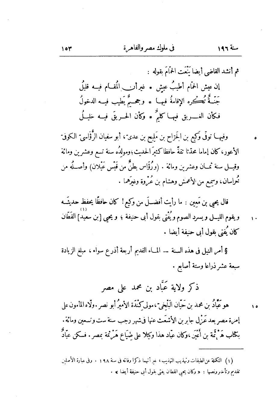 وفيها توفي وكيع بن الجراح بن مليح بن عدي، أبو سفيان الرؤاسي الكوفي الأعور، كان إماماً محدثاً ثقة حافظا كثيرا الحديث؛ ومولده سنة تسع وعشرين ومائة وقيل سنة ثمان وعشرين ومائة. (ورؤاس بطن من قيس عيلان) وأصله من خراسان، وسمع من الأعمش وهشام بن عروة وغيرهما.
