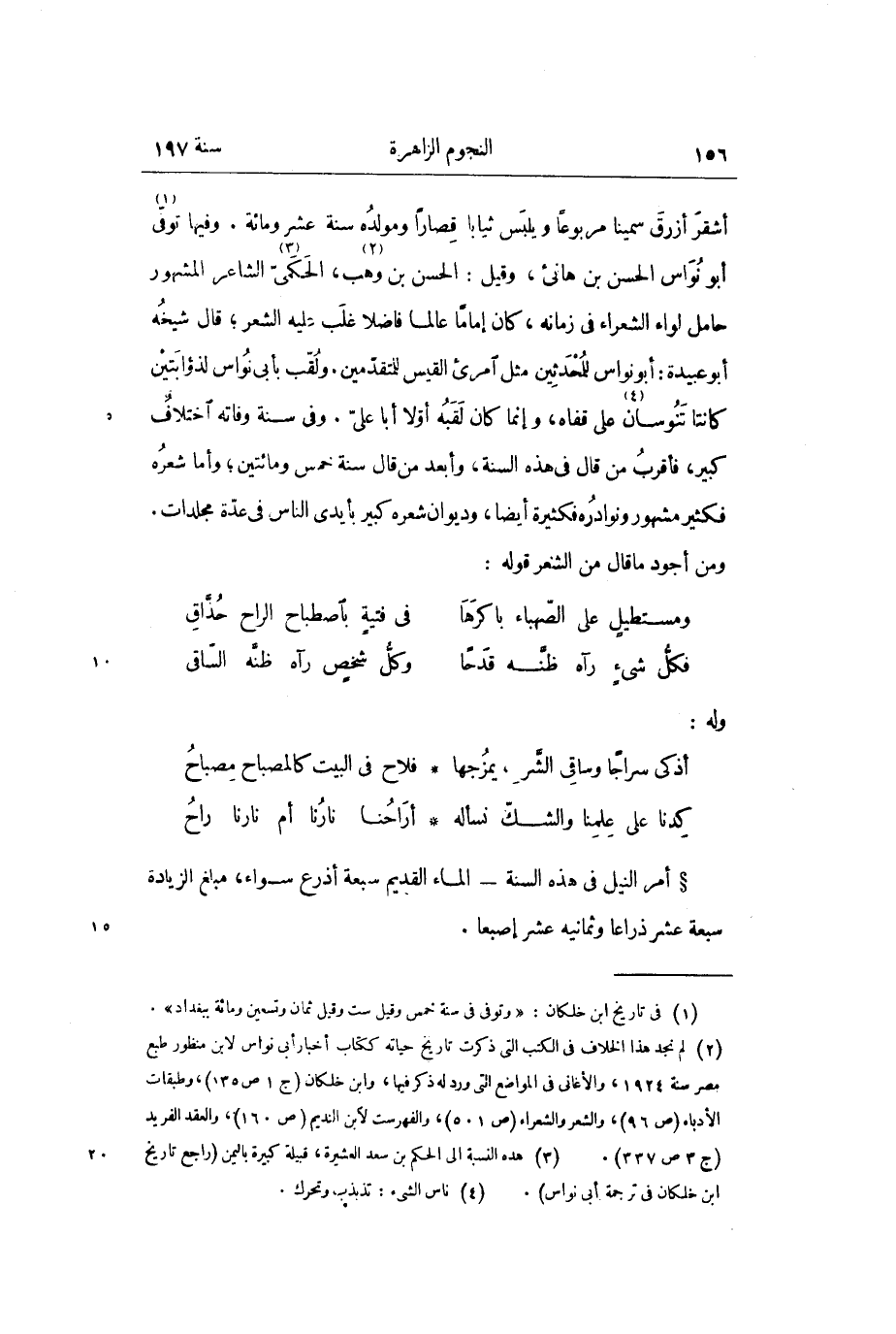 أشقر أزرق سميناً مربوعاً ويلبس ثياباً قصاراً ومولده سنة عشر ومائة. وفيها توفي «1» أبو نواس الحسن بن هانئ، وقيل: الحسن بن وهب «2» ، الحكمي «3» الشاعر المشهور حامل لواء الشعراء في زمانه، كان إماماً عالماً فاضلاً غلب عليه الشعر؛ قال شيخه أبو عبيدة: أبو نواس للمحدثين مثل امرئ القيس للمتقدمين. ولقب بأبي نواس لذؤابتين كانتا تنوسان «4» على قفاه، وإنما كان لقبه أولاً أبا علي. وفي سنة وفاته اختلاف كبير، فأقرب من قال في هذه السنة، وأبعد من قال سنة خمس ومائتين؛ وأما شعره فكثير مشهور ونوادره فكثيرة أيضاً، وديوان شعره كبير بأيدي الناس في عدة مجلدات.