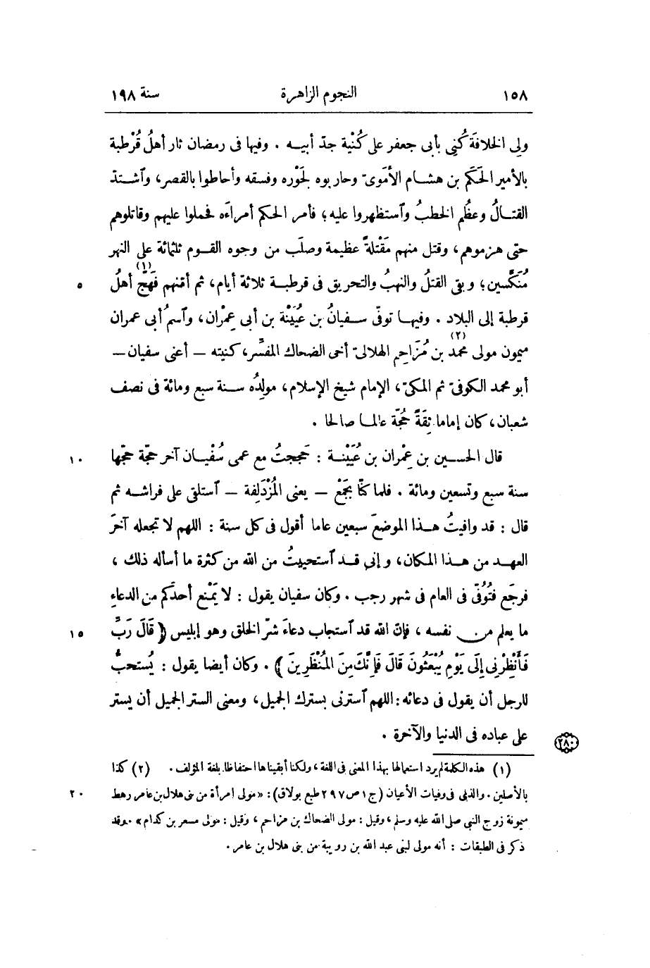ولي الخلافة كني بأبي جعفر على كنية جد أبيه. وفيها في رمضان ثار أهل قرطبة بالأمير الحكم بن هشام الأموي وحاربوه لجوره وفسقه وأحاطوا بالقصر، وأشتد القتال وعظم الخطب واستظهروا عليه؛ فأمر الحكم أمراءه فحملوا عليهم وقاتلوهم حتى هزموهم، وقتل منهم مقتلة عظيمة وصلب من وجوه القوم ثلثمائة على النهر منكسين؛ وبقي القتل والنهب والتحريق في قرطبة ثلاثة أيام، ثم أمنهم فهج «1» أهل قرطبة إلى البلاد. وفيها توفي سفيان بن عيينة بن أبي عمران، وأسم أبي عمران ميمون مولى محمد «2» بن مزاحم الهلالي أخى الضحاك المفسّر، كنيته- أعني سفيان- أبو محمد الكوفي ثم المكي، الإمام شيخ الإسلام، مولده سنة سبع ومائة في نصف شعبان، كان إماماً ثقة حجة عالماً صالحاً.