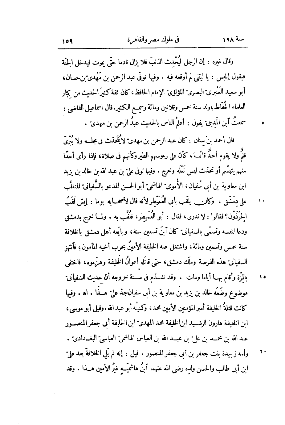قال أحمد بن سنان: كان عبد الرحمن بن مهدي لا يتحدث في مجلسه ولا يبرى قلم ولا يقوم أحد قائماً، كأنّ على رءوسهم الطير وكأنهم في صلاة، فإذا رأى أحداً منهم يتبسم أو تحدث لبس نعله وخرج. وفيها توفي علي بن عبد الله بن خالد بن يزيد ابن معاوية بن أبي سفيان، الأموي الهاشمي أبو الحسن المدعو بالسفياني المتغلب على دمشق، وكان يلقب بأبي العميطر لأنه قال لأصحابه يوماًَ: إيش لقب الجرذون؟ فقالوا: لا ندري، فقال: أبو العميطر، فلقب به. ولما خرج بدمشق ودعا لنفسه وتسمى بالسفياني كان ابن تسعين سنة، وبايعه أهل دمشق بالخلافة سنة خمس وتسعين ومائة، واشتغل عنه الخليفة الأمين بحرب أخيه المأمون؛ فانتهز السفياني هذه الفرصة وملك دمشق، حتى قاتله أعوان الخليفة وهزموه، فاختفى بالمزة وأقام بها أياماً ومات. وقد تقدم في سنة خروجه أن حديث السفياني موضوع وضعه خالد بن يزيد بن معاوية بن أبي سفيان جدّ علىّ هذا. اهـ. وفيها كانت قتلة الخليفة أمير المؤمنين الأمين محمد، وكنيته أبو عبد الله. وقيل أبو موسى، ابن الخليفة هارون الرشيد ابن الخليفة محمد المهدي ابن الخليفة أبي جعفر المنصور عبد الله بن محمد بن علي بن عبد الله بن العباس الهاشمي العباسي البغدادي.