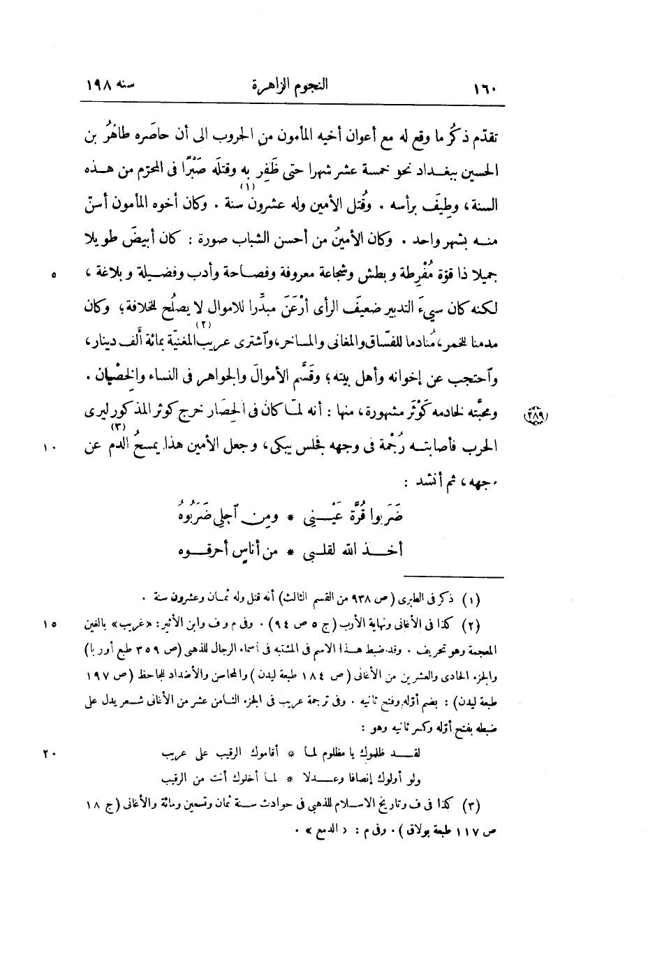 تقدم ذكر ما وقع له مع أعوان أخيه المأمون من الحروب إلى أن حاصره طاهر بن الحسين ببغداد نحو خمسة عشر شهراً حتى ظفر به وقتله صبراً في المحرم من هذه السنة، وطيف برأسه. وقتل الأمين وله عشرون «1» سنة. وكان أخوه المأمون أسن منه بشهر واحد. وكان الأمين من أحسن الشباب صورة: كان أبيض طويلاً جميلاً ذا قوة مفرطة وبطش وشجاعة معروفة وفصاحة وأدب وفضيلة وبلاغة، لكنه كان سيىء التدبير ضعيف الرأى أرعن مبدّرا للاموال لا يصلح للخلافة؛ وكان مدمناً للخمر، منادماً للفساق والمغاني والمساخر، واشترى عريب «2» المغنية بمائة ألف دينار، واحتجب عن إخوانه وأهل بيته؛ وقسّم الأموال والجواهر في النساء والخصيان.