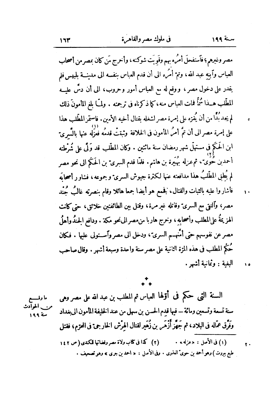 السنة التي حكم في أولها العباس ثم المطلب بن عبد الله على مصر وهي سنة تسعة وتسعين ومائة- فيها قدم الحسن بن سهل من عند الخليفة المأمون إلى بغداد وفرق عماله في البلاد، ثم جهز أزهر بن زهير لقتال الهرش الخارجي في المحرم؛ فقتل