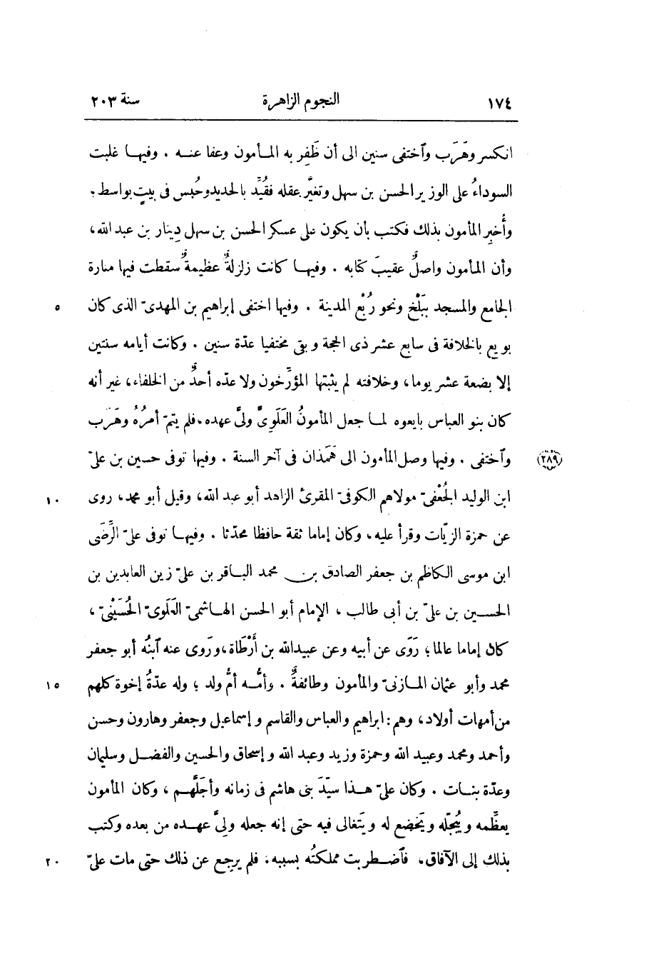 انكسر وهرب واختفى سنين إلى أن ظفر به المأمون وعفا عنه. وفيها غلبت السوداء على الوزير الحسن بن سهل وتغير عقله فقيد بالحديد وحبس في بيت بواسط؛ وأخبر المأمون بذلك فكتب بأن يكون على عسكر الحسن بن سهل دينار بن عبد الله، وأن المأمون واصل عقيب كتابه. وفيها كانت زلزلة عظيمة سقطت فيها منارة الجامع والمسجد ببلخ ونحو ربع المدينة. وفيها اختفى إبراهيم بن المهدي الذي كان بويع بالخلافة في سابع عشر ذي الحجة وبقي مختفياً عدة سنين. وكانت أيامه سنتين إلا بضعة عشر يوماً، وخلافته لم يثبتها المؤرخون ولا عده أحد من الخلفاء، غير أنه كان بنو العباس بايعوه لما جعل المأمون العلوي ولي عهده، فلم يتم أمره وهرب واختفى. وفيها وصل المأمون إلى همذان في آخر السنة. وفيها توفى حسين بن علىّ ابن الوليد الجعفىّ مولاهم الكوفىّ المقرئ الزاهد أبو عبد الله، وقيل أبو محمد، روى عن حمزة الزيات وقرأ عليه، وكان إماماً ثقة حافظاً محدثاً. وفيها توفي علي الرّضى ابن موسى الكاظم بن جعفر الصادق بن محمد الباقر بن علي زين العابدين بن الحسين بن علي بن أبى طالب، الإمام أبو الحسن الهاشمىّ العلوىّ الحسينىّ، كان إماما عالما؛ روى عن أبيه وعن عبيد الله بن أرطاة، وروى عنه ابنه أبو جعفر محمد وأبو عثمان المازني والمأمون وطائفة. وأمه أم ولد؛ وله عدة إخوة كلهم من أمهات أولاد، وهم: ابراهيم والعباس والقاسم وإسماعيل وجعفر وهارون وحسن وأحمد ومحمد وعبيد الله وحمزة وزيد وعبد الله وإسحاق والحسين والفضل وسليمان وعدة بنات. وكان علي هذا سيد بني هاشم في زمانه وأجلّهم، وكان المأمون يعظمه ويبجله ويخضع له ويتغالى فيه حتى إنه جعله ولي عهده من بعده وكتب بذلك إلى الأفاق، فاضطربت مملكته بسببه، فلم يرجع عن ذلك حتى مات علىّ