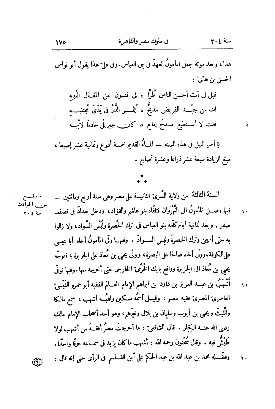 السنة الثالثة من ولاية السري الثانية على مصر وهي سنة أربع ومائتين- فيها وصل المأمون إلى النهروان فتلقاه بنو هاشم والقواد، ودخل بغداد في نصف صفر؛ وبعد ثمانية أيام كلمه بنو العباس في ترك الخضرة ولبس السواد، ولا زالوا به حتى أذعن وترك الخضرة ولبس السواد. وفيها ولى المأمون أخاه أبا عيسى على الكوفة، وولى أخاه صالحاً على البصرة، وولى يحيى بن معاذ على الجزيرة؛ فتوجه يحيى بن معاذ إلى الجزيرة وواقع بابك الخرّمىّ الخارجي حتى أخرجه منها. وفيها توفي أشهب بن عبد العزيز بن داود بن إبراهيم الإمام العالم الفقيه أبو عمرو القيسي العامري المصري فقيه مصر، وقيل اسمه مسكين ولقبه أشهب، سمع مالكاً والليث ويحيى بن أيوب وسليمان بن بلال وغيرهم، وهو أحد أصحاب الإمام مالك رضي الله عنه الكبار. قال الشافعي: ما أخرجت مصر أفقه من أشهب لولا طيش فيه. وقال سحنون رحمه الله: أشهب ما كان يزيد في سماعه حرفاً واحداً.