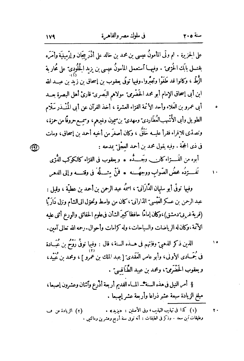 على الجزيرة. ثم ولى المأمون عيسى بن محمد بن خالد على أذربيجان وإرمينية وأمره بقتل بابك الحرّمىّ. وفيها استعمل المأمون عيسى بن يزيد الجلودي على محاربة الزط، وكانوا قد طغوا وتجبروا. وفيها توفي يعقوب بن إسحاق بن زيد «1» بن عبد الله ابن أبي إسحاق الإمام أبو محمد الحضرمي مولاهم البصرىّ قارئ أهل البصرة بعد أبي عمرو بن العلاء وأحد الأئمة القراء العشرة، أخذ القرآن عن أبى المنذر سلّام الطويل وأبى الأشهب العطاردىّ ومهدي بن ميمون وغيرهم، وسمع حروفاً من حمزة، وتصدى للإقراء فقرأ عليه خلق، وكان أصغر من أخيه أحمد بن إسحاق، ومات في ذي الحجة. وفيه يقول محمد بن أحمد العجلىّ يمدحه: