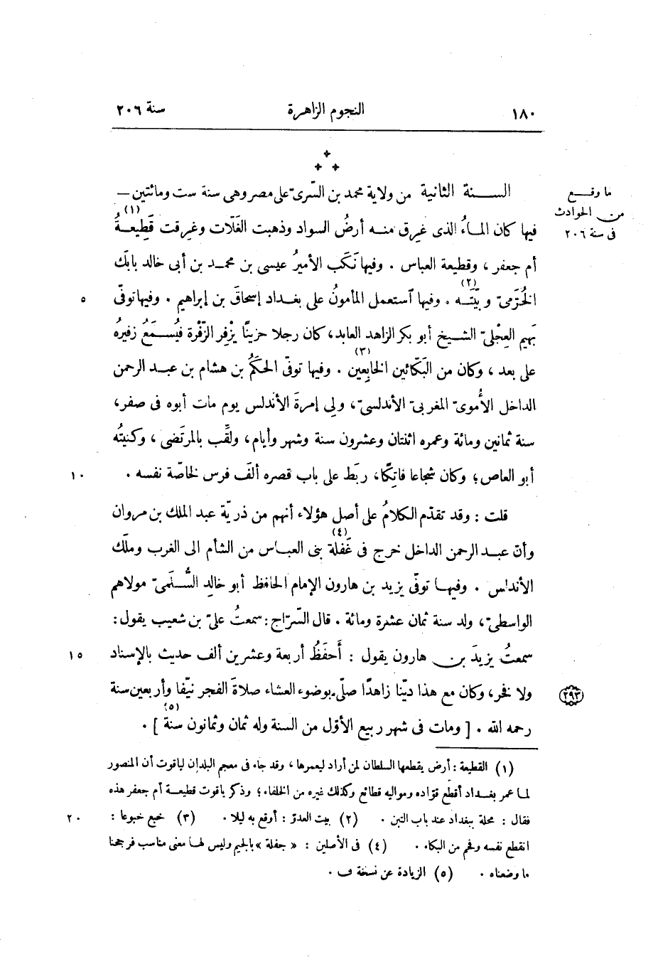 السنة الثانية من ولاية محمد بن السري على مصر وهي سنة ست ومائتين- فيها كان الماء الذي غرق منه أرض السواد وذهبت الغلات وغرقت قطيعة «1» أم جعفر، وقطيعة العباس. وفيها نكب الأمير عيسى بن محمد بن أبى خالد بابك الخرّمىّ وبيته «2» . وفيها استعمل المأمون على بغداد إسحاق بن إبراهيم. وفيها توفي بهيم العجلي الشيخ أبو بكر الزاهد العابد، كان رجلاً حزيناً يزفر الزفرة فيسمع زفيره على بعد، وكان من البكّائين الخابعين «3» . وفيها توفي الحكم بن هشام بن عبد الرحمن الداخل الأموي المغربي الأندلسي، ولي إمرة الأندلس يوم مات أبوه في صفر، سنة ثمانين ومائة وعمره اثنتان وعشرون سنة وشهر وأيام، ولقب بالمرتضى، وكنيته أبو العاص؛ وكان شجاعاً فاتكاً، ربط على باب قصره ألف فرس لخاصة نفسه.
