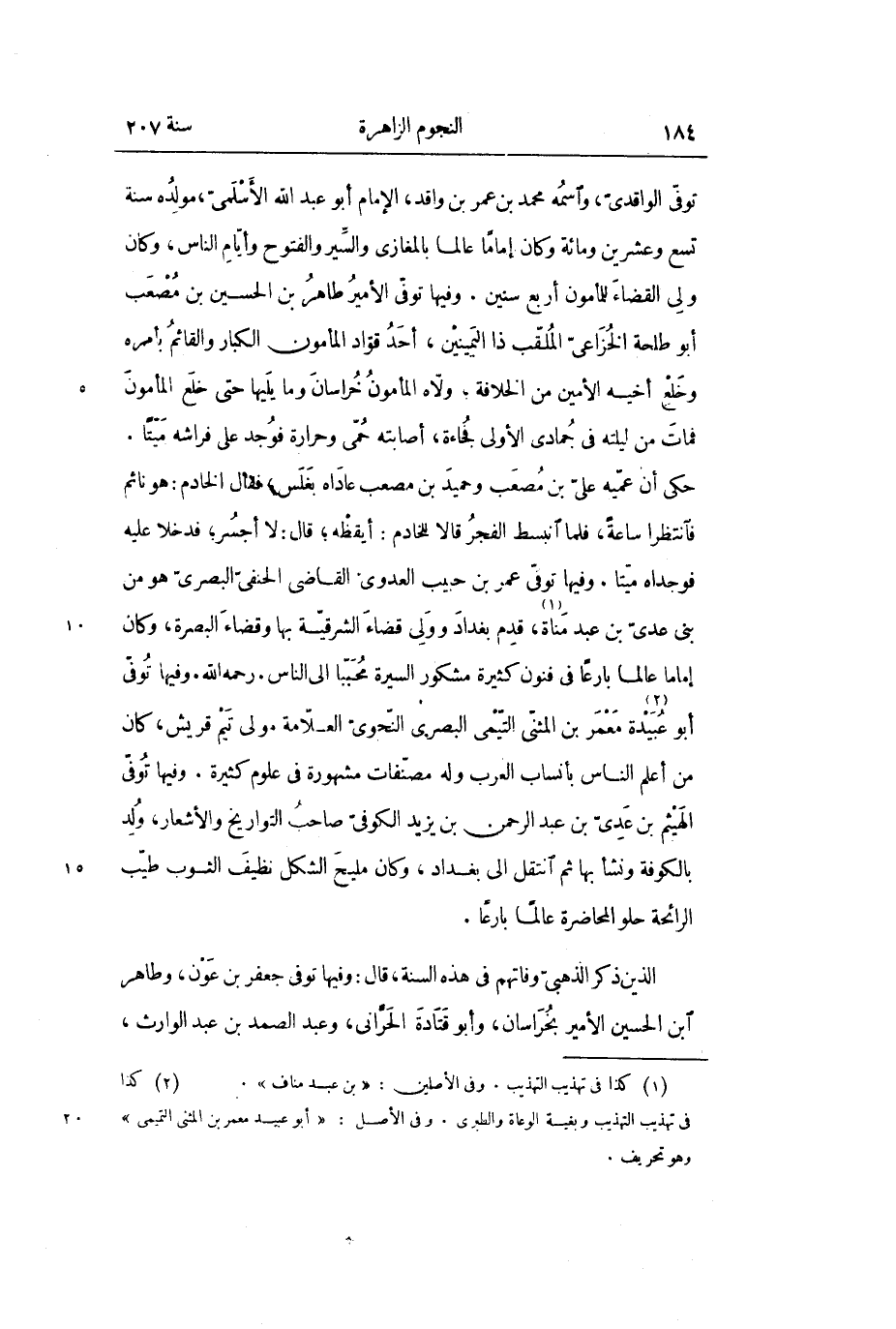 حكي أن عميه علي بن مصعب وحميد بن مصعب عاداه بغلس، فقال الخادم: هو نائم فانتظرا ساعة، فلما انبسط الفجر قالا للخادم: أيقظه؛ قال: لا أجسر؛ فدخلا عليه فوجداه ميتاً. وفيها توفي عمر بن حبيب العدوي القاضي الحنفي البصري هو من بنى عدىّ بن عبد مناة «1» ، قدم بغداد وولي قضاء الشرقية بها وقضاء البصرة، وكان إماماً عالماً بارعاً في فنون كثيرة مشكور السيرة محبباً إلى الناس. رحمه الله. وفيها توفي أبو عبيدة «2» معمر بن المثنى التيمي البصري النحوي العلامة مولى تيم قريش، كان من أعلم الناس بأنساب العرب وله مصنفات مشهورة في علوم كثيرة. وفيها توفي الهيثم بن عدي بن عبد الرحمن بن يزيد الكوفي صاحب التواريخ والأشعار، ولد بالكوفة ونشأ بها ثم انتقل إلى بغداد، وكان مليح الشكل نظيف الثوب طيب الرائحة حلو المحاضرة عالماً بارعاً.