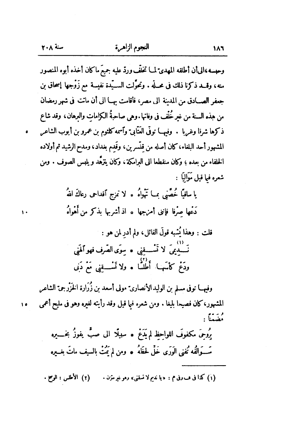 وحبسه، إلى أن أطلقه المهدي لما تخلف ورد عليه جميع ما كان أخذه أبوه المنصور منه، وقد ذكرنا ذلك في محله. وتحولت السيدة نفيسة مع زوجها إسحاق بن جعفر الصادق من المدينة إلى مصر، فأقامت بها إلى أن ماتت في شهر رمضان من هذه السنة من غير خلف في وفاتها. وهي صاحبة الكرامات والبرهان، وقد شاع ذكرها شرقاً وغرباً. وفيها توفي العتابي واسمه كلثوم بن عمرو بن أيوب الشاعر المشهور أحد البلغاء، كان أصله من قنسرين، وقدم بغداد، ومدح الرشيد ثم أولاده الخلفاء من بعده؛ وكان منقطعاً إلى البرامكة، وكان يتزهد ويلبس الصوف. ومن شعره فيما قيل موالياً: