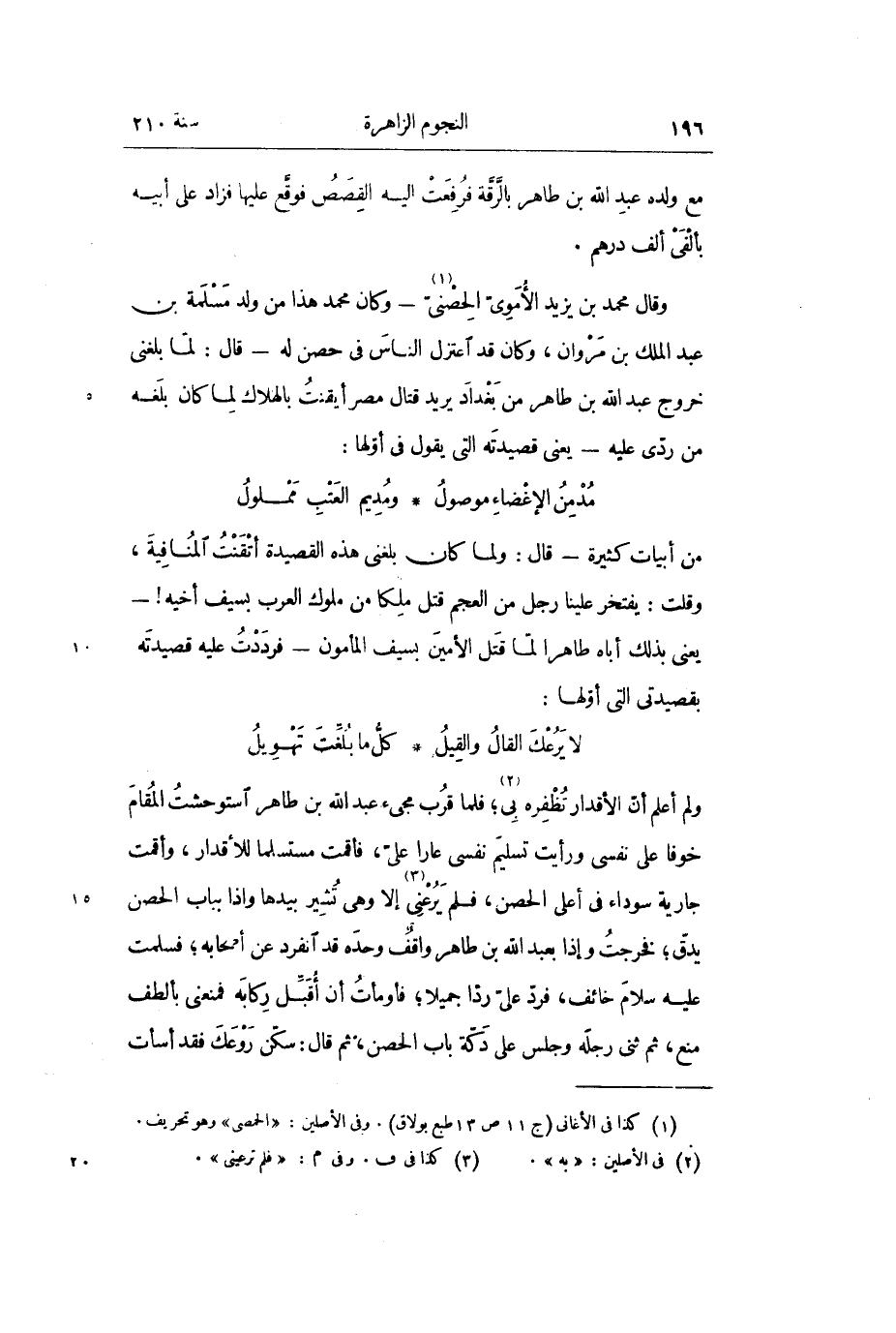 وقال محمد بن يزيد الأموي الحصني «1» - وكان محمد هذا من ولد مسلمة بن عبد الملك بن مروان، وكان قد اعتزل الناس في حصن له- قال: لما بلغني خروج عبد الله بن طاهر من بغداد يريد قتال مصر أيقنت بالهلاك لما كان بلغه من ردي عليه- يعنى قصيدته التى يقول فى أوّلها: