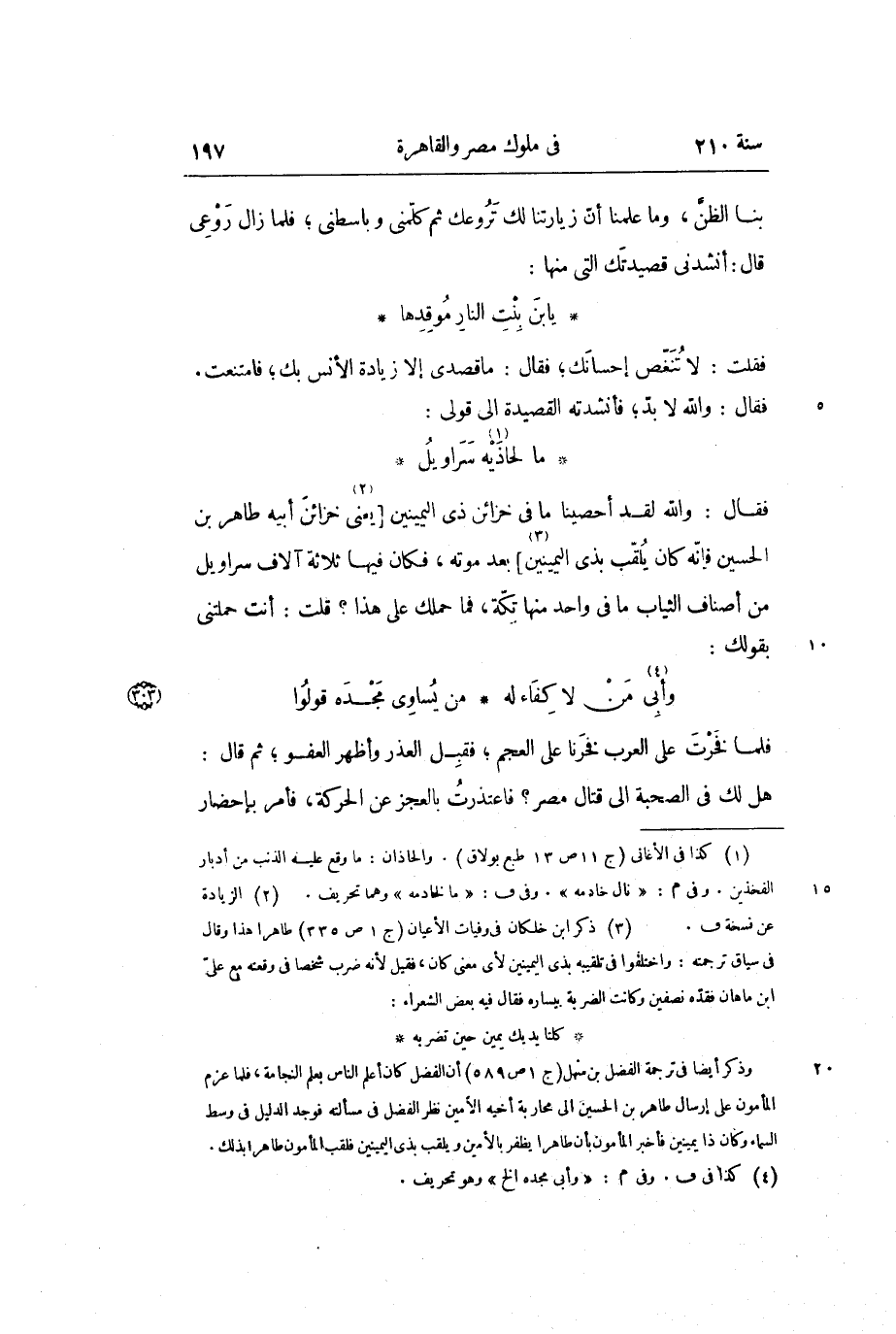 فقال: والله لقد أحصينا ما في خزائن ذي اليمينين [يعني «2» خزائن أبيه طاهر بن الحسين فإنه كان يلقب بذي اليمينين «3» ] بعد موته، فكان فيها ثلاثة آلاف سراويل من أصناف الثياب ما في واحد منها تكة، فما حملك على هذا؟ قلت: أنت حملتنى بقولك:
