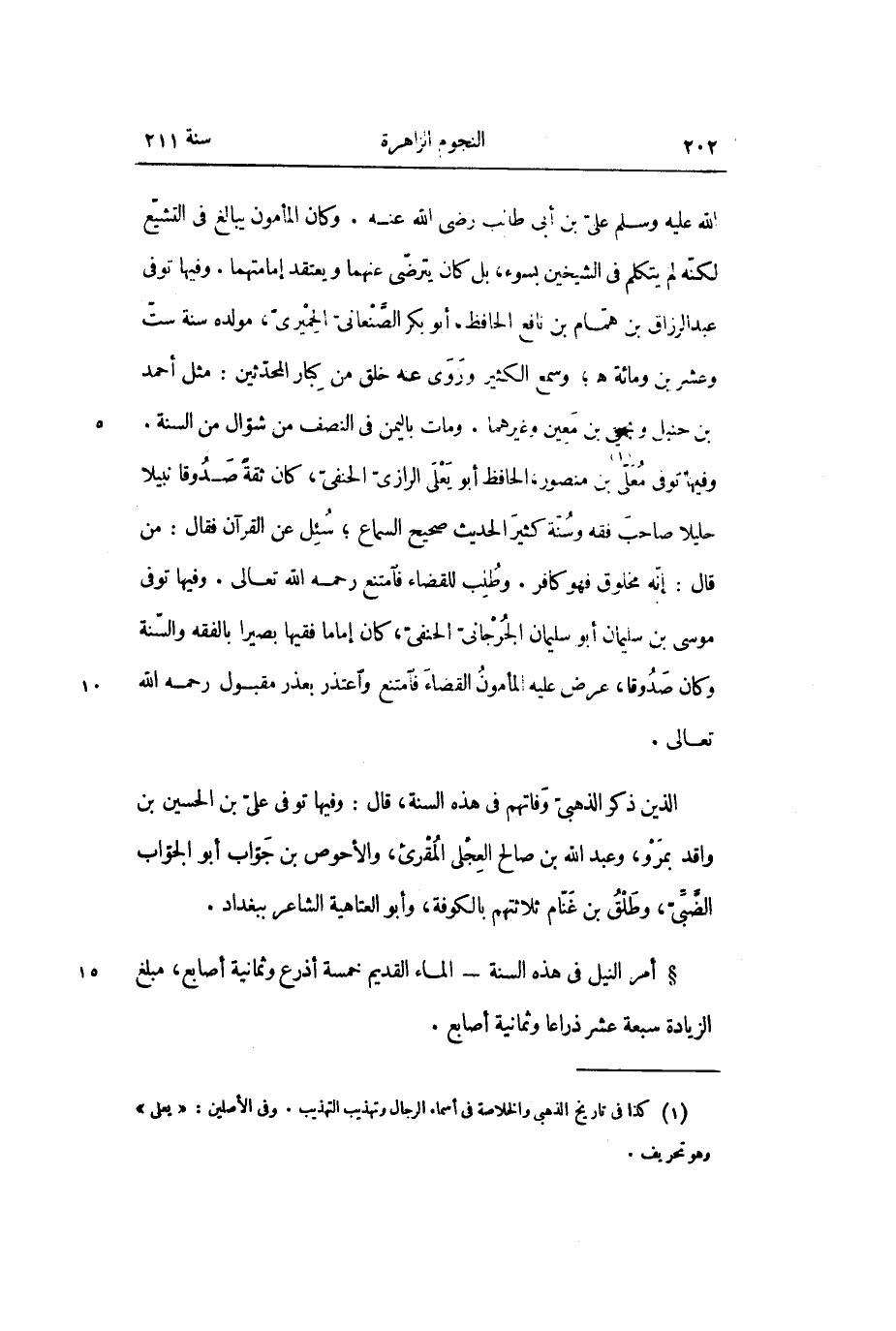 الله عليه وسلم علي بن أبي طالب رضي الله عنه. وكان المأمون يبالغ في التشيع لكنه لم يتكلم في الشيخين بسوء، بل كان يترضى عنهما ويعتقد إمامتهما. وفيها توفي عبد الرزاق بن همام بن نافع الحافظ، أبو بكر الصنعاني الحميري، مولده سنة ستّ وعشرين ومائة هـ؛ وسمع الكثير وروى عنه خلق من كبار المحدثين: مثل أحمد بن حنبل ويحيى بن معين وغيرهما. ومات باليمن في النصف من شوال من السنة.
