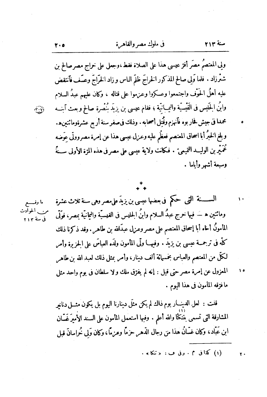 السنة التي حكم في بعضها عيسى بن يزيد على مصر وهي سنة ثلاث عشرة ومائتين هـ- فيها خرج عبد السلام وابن الجليس في القيسية واليمانية بمصر، فولى المأمون أخاه أبا إسحاق المعتصم على مصر وعزل عبد الله بن طاهر. وقد ذكرنا ذلك كله في ترجمة عيسى بن يزيد. وفيها ولى المأمون ولده العباس على الجزيرة وأمر لكل من المعتصم والعباس بخمسمائة ألف دينار، وأمر بمثل ذلك لعبد الله بن طاهر المعزول عن إمرة مصر حتى قيل: إنه لم يفرق ملك ولا سلطان في يوم واحد مثل ما فرقه المأمون في هذا اليوم.