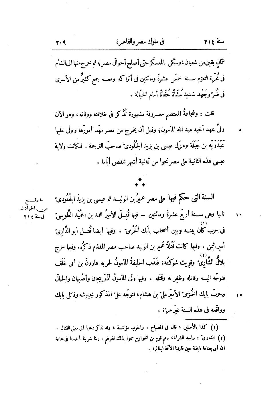 السنة التى حكم فيها على مصر عمير بن الوليد ثم عيسى بن يزيد الجلودي ثانياً وهي سنة أربع عشرة ومائتين- فيها قتل الأمير محمد بن الحميد الطوسي في حرب كان «1» بينه وبين أصحاب بابك الخرمي. وفيها أيضاً قتل أبو الداري أمير اليمن. وفيها كانت قتلة عمير بن الوليد صاحب مصر المقدم ذكره. وفيها خرج بلال الشاري «2» وقويت شوكته، فندب الخليفة المأمون لحربه هارون بن أبي خلف فتوجه إليه وقاتله وظفر به وقتله. وفيها ولى المأمون أذربيجان وأصبهان والجبال وحرب بابك الخرّمىّ الأمير علي بن هشام، فتوجه علي المذكور بجيوشه وقاتل بابك وواقعه في هذه السنة غير مرّة.