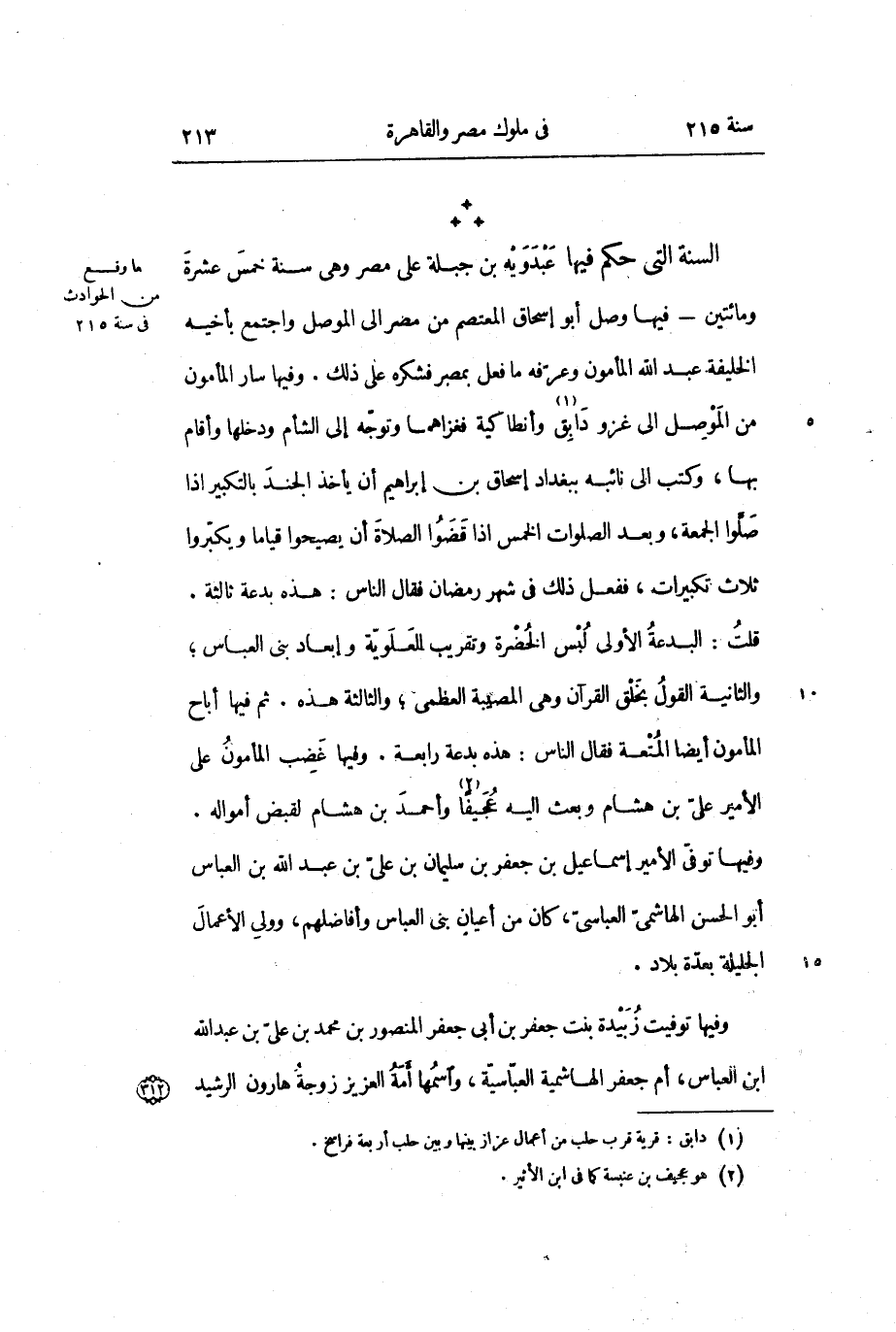 السنة التى حكم فيها عبدويه بن جبلة على مصر وهى سنة خمس عشرة ومائتين- فيها وصل أبو إسحاق المعتصم من مصر الى الموصل واجتمع بأخيه الخليفة عبد الله المأمون وعرّفه ما فعل بمصر فشكره على ذلك. وفيها سار المأمون من الموصل الى غزو دابق «1» وأنطاكية فغزاهما وتوجّه إلى الشأم ودخلها وأقام بها، وكتب الى نائبه ببغداد إسحاق بن إبراهيم أن يأخذ الجند بالتكبير اذا صلّوا الجمعة، وبعد الصلوات الخمس اذا قضوا الصلاة أن يصيحوا قياما ويكبّروا ثلاث تكبيرات، ففعل ذلك فى شهر رمضان فقال الناس: هذه بدعة ثالثة.