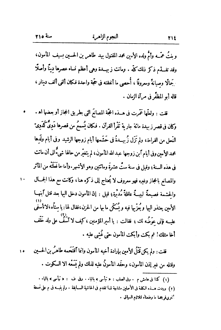 وكان فى قصر زبيدة مائة جارية تقرأ القرآن. فكان يسمع من قصرها دوىّ كدوىّ النّحل من القراءة، ولم تزل زبيدة فى حشمها أيام زوجها الرشيد وفى أيام ولدها محمد الأمين وفى أيام ابن زوجها عبد الله المأمون، لم يتغيّر من حالها شىء الى أن ماتت فى هذه السنة؛ وقيل فى سنة ستّ عشرة ومائتين وهو الأشهر. وأما ما فعلته من المآثر والمصانع بالحجاز وغيره فهو معروف لا يحتاج إلى ذكره هنا، وكانت مع هذا الجمال والحشمة فصيحة لبيبة عاقلة مدبّرة؛ قيل: إنّ المأمون دخل اليها بعد قتل ابنها الأمين يعتذر اليها ويعزّيها فيه ويسكّن ما بها من الحزن، فقال لها: يا ستّاه، لا تأسفى «1» عليه فإنى عوضه لك؛ فقالت: يا أمير المؤمنين، كيف لا آسف «2» على ولد خلّف أخا مثلك! ثم بكت وأبكت المأمون حتى غشى عليه.