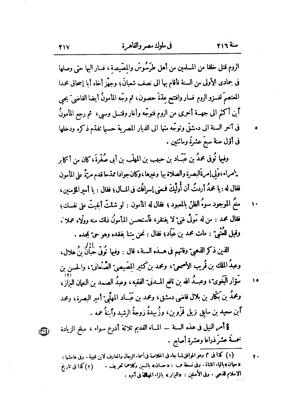 الروم قتل خلقا من المسلمين من أهل طرسوس والمصّيصة، فسار اليها حتى وصلها فى جمادى الأولى من السنة فأقام بها الى نصف شعبان؛ وجهّز أخاه أبا إسحاق محمدا المعتصم لغزو الروم فسار وافتتح عدّة حصون، ثم وجّه المأمون أيضا القاضى يحيى ابن أكثم الى جهة أخرى من الروم فتوجّه وأغار وقتل وسبى، ثم رجع المأمون فى آخر السنة الى دمشق وتوجّه منها الى الديار المصرية حسبما تقدّم ذكره ودخلها فى أوّل سنة سبع عشرة ومائتين.