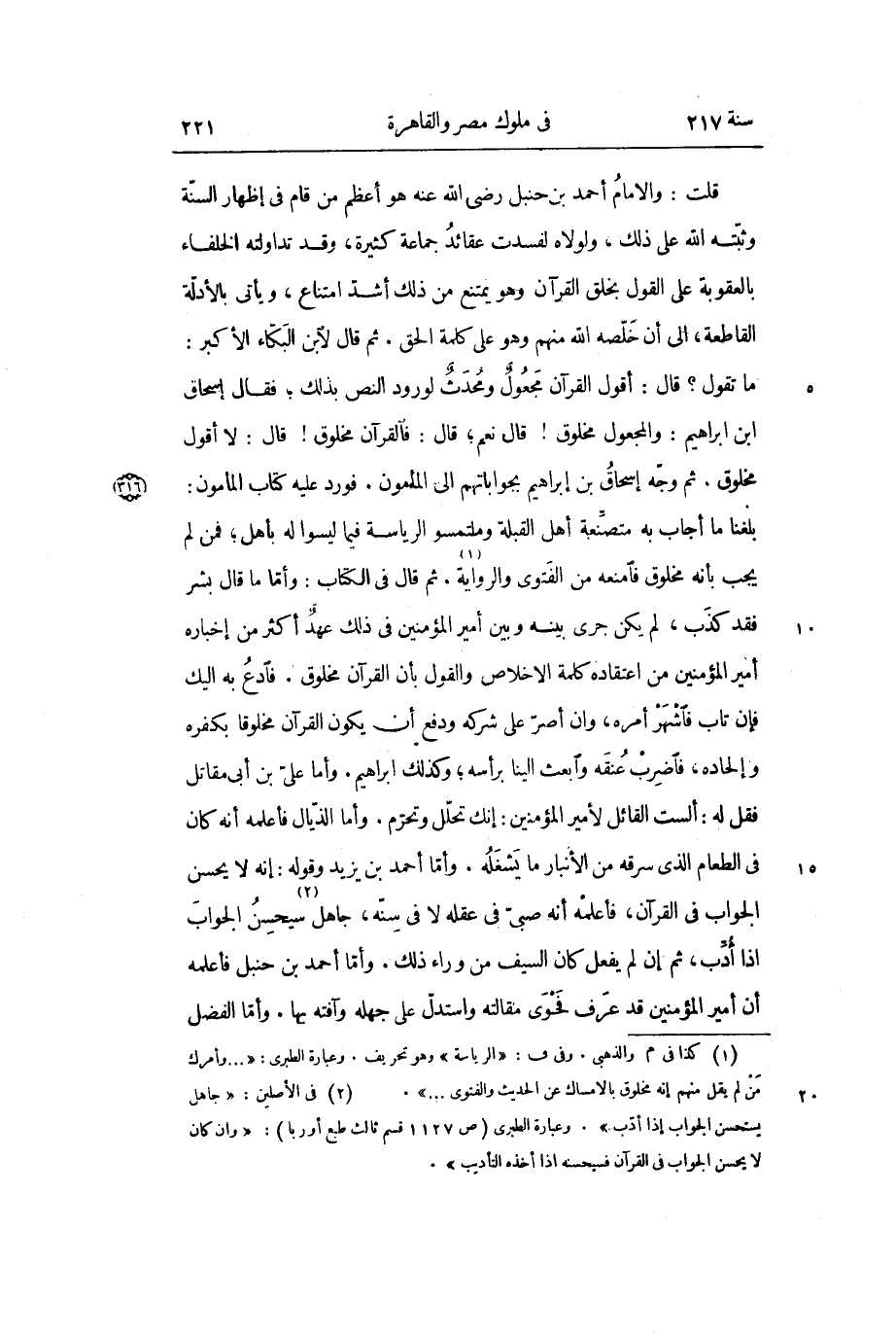 قلت: والامام أحمد بن حنبل رضى الله عنه هو أعظم من قام فى إظهار السنّة وثبّته الله على ذلك، ولولاه لفسدت عقائد جماعة كثيرة، وقد تداولته الخلفاء بالعقوبة على القول بخلق القرآن وهو يمتنع من ذلك أشدّ امتناع، ويأتى بالأدلّة القاطعة، الى أن خلّصه الله منهم وهو على كلمة الحق. ثم قال لابن البكّاء الأكبر: