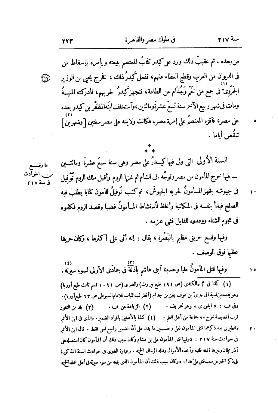السنة الأولى التى ولى فيها كيدر على مصر وهى سنة سبع عشرة ومائتين- فيها خرج المأمون من مصر وتوجّه الى الشأم ثم غزا الروم وأقبل ملك الروم توفيل فى جيوشه فجهز المأمون لحربه الجيوش، ثم كتب توفيل للمأمون كتابا يطلب فيه الصلح فبدأ بنفسه فى المكاتبة وأغلظ فاستشاط المأمون غضبا وقصد الروم فكلموه فى هجوم الشتاء ووعدوه للقابل فثنى عزمه.