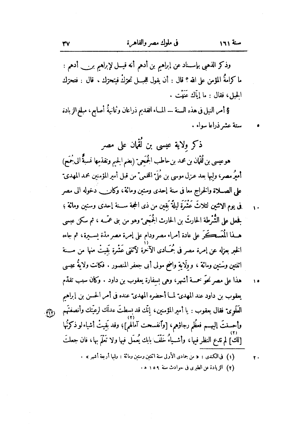 هو عيسى بن لقمان بن محمد بن حاطب الجمحي (بضم الجيم وتقدمها نسبة إلى جمح) أمير مصر، وليها بعد عزل موسى بن علي اللخمي من قبل أمير المؤمنين محمد المهدىّ على الصلاة والخراج معاً في سنة إحدى وستين ومائة، وكان دخوله إلى مصر في يوم الاثنين لثلاث عشرة ليلة بقين من ذي الحجة سنة إحدى وستين ومائة؛ فجعل على الشرطة الحارث بن الحارث الجمحي وهو من بني عمه، ثم سكن عيسى هذا المعسكر على عادة أمراء مصر ودام على إمرة مصر مدة يسيرة، ثم جاءه الخبر بعزله عن إمرة مصر في جمادى الآخرة «1» لاثنتي عشرة بقيت منها من سنة اثنتين وستين ومائة، وولاية واضح مولى أبي جعفر المنصور. فكانت ولاية عيسى هذا على مصر نحو خمسة أشهر، وهي بسفارة يعقوب بن داود. وكان سبب تقدم يعقوب بن داود عند المهدي لما أحضره المهدي عنده في أمر الحسن بن إبراهيم العلوي فقال يعقوب: يا أمير المؤمنين، إنك قد بسطت عدلك لرعيتك وأنصفتهم وأحسنت إليهم فعظم رجاؤهم، [وانفسحت آمالهم «2» ] ؛ وقد بقيت أشياء لو ذكرتها [لك «3» ] لم تدع النظر فيها، وأشياء خلف بابك يعمل فيها ولا تعلم بها، فإن جعلت