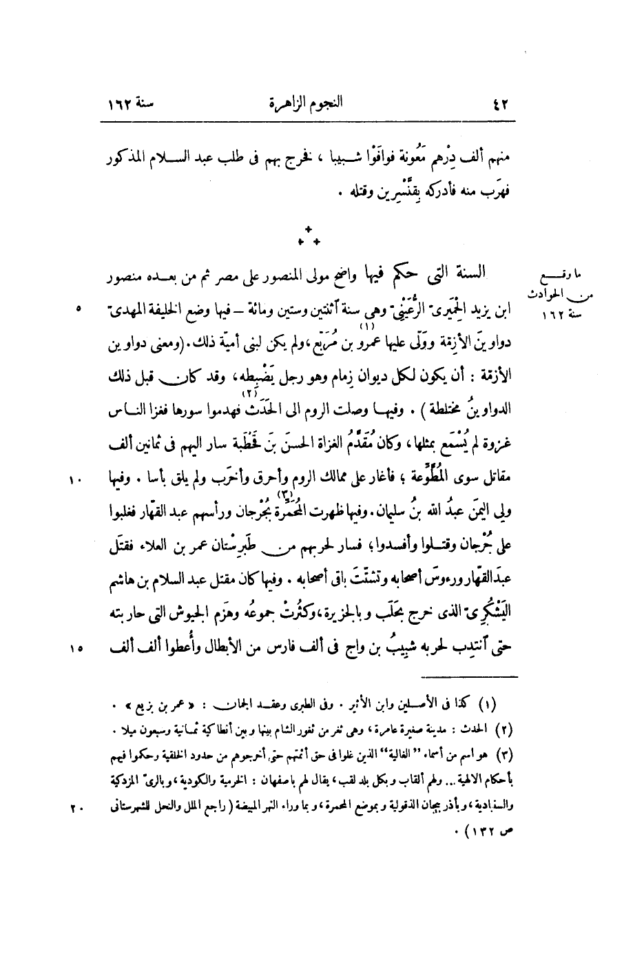 السنة التي حكم فيها واضح مولى المنصور على مصر ثم من بعده منصور ابن يزيد الحميري الرعيني وهي سنة اثنتين وستين ومائة- فيها وضع الخليفة المهدي دواوين الأزمة وولى عليها عمرو «1» بن مربع، ولم يكن لبني أمية ذلك. (ومعنى دواوين الأزمة: أن يكون لكل ديوان زمام وهو رجل يضبطه، وقد كان قبل ذلك الدواوين مختلطة) . وفيها وصلت الروم إلى الحدث «2» فهدموا سورها فغزا الناس غزوة لم يسمع بمثلها، وكان مقدم الغزاة الحسن بن قحطبة سار إليهم في ثمانين ألف مقاتل سوى المطوعة؛ فأغار على ممالك الروم وأحرق وأخرب ولم يلق بأساً. وفيها ولي اليمن عبد الله بن سليمان. وفيها ظهرت المحمّرة «3» بجرجان ورأسهم عبد القهار فغلبوا على جرجان وقتلوا وأفسدوا؛ فسار لحربهم من طبرستان عمر بن العلاء فقتل عبد القهّار ورءوس أصحابه وتشتت باقي أصحابه. وفيها كان مقتل عبد السلام بن هاشم اليشكري الذي خرج بحلب وبالجزيرة، وكثرت جموعه وهزم الجيوش التي حاربته حتى انتدب لحربه شبيب بن واج في ألف فارس من الأبطال وأعطوا ألف ألف