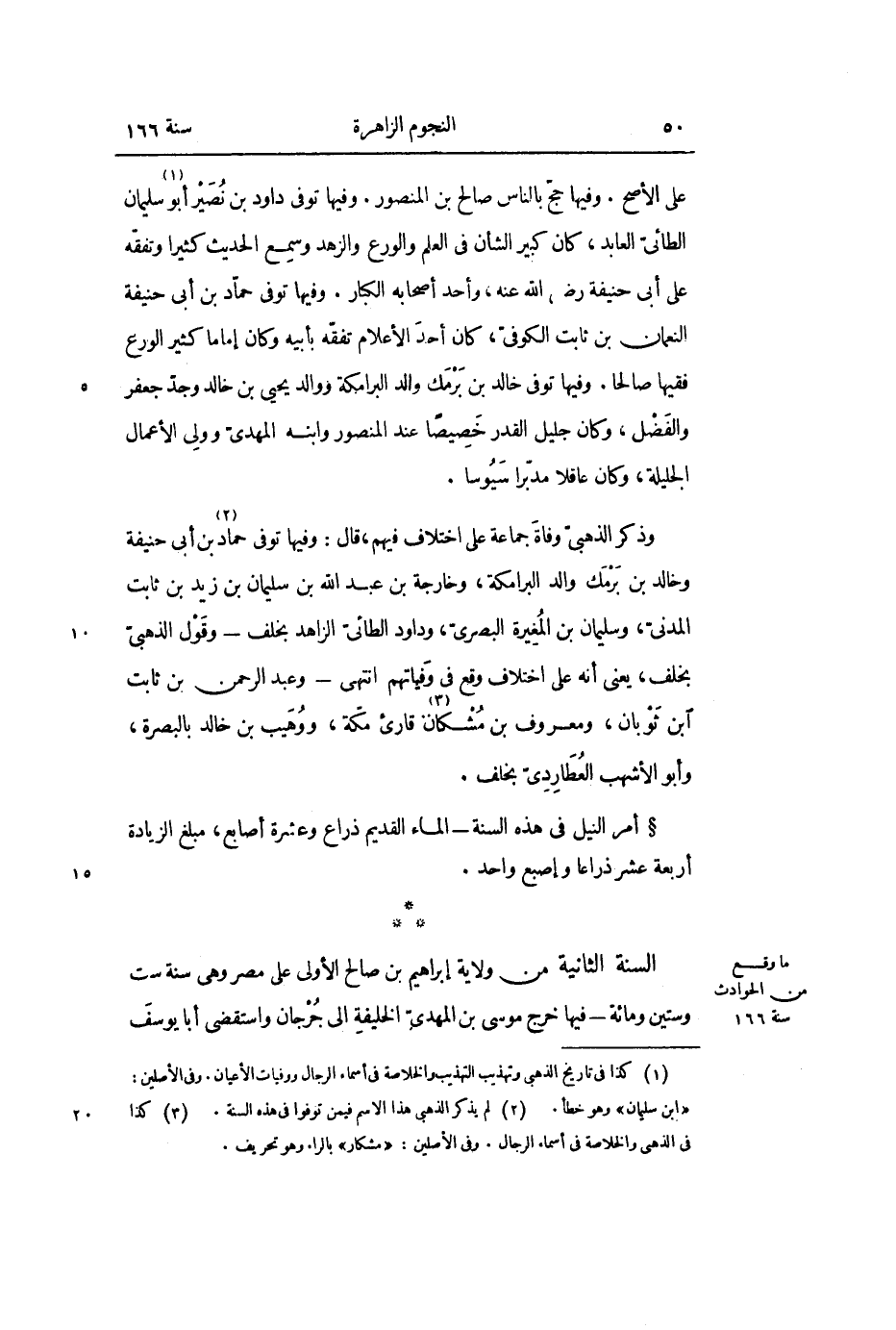 على الأصح. وفيها حج بالناس صالح بن المنصور. وفيها توفي داود بن نصير أبو «1» سليمان الطائىّ العابد، كان كبير الشأن في العلم والورع والزهد وسمع الحديث كثيراً وتفقه على أبي حنيفة رضي الله عنه، وأحد أصحابه الكبار. وفيها توفي حماد بن أبي حنيفة النعمان بن ثابت الكوفي، كان أحد الأعلام تفقه بأبيه وكان إماماً كثير الورع فقيهاً صالحاً. وفيها توفي خالد بن برمك والد البرامكة ووالد يحيى بن خالد وجد جعفر والفضل، وكان جليل القدر خصيصاً عند المنصور وابنه المهدي وولي الأعمال الجليلة، وكان عاقلاً مدبراً سيوساً.