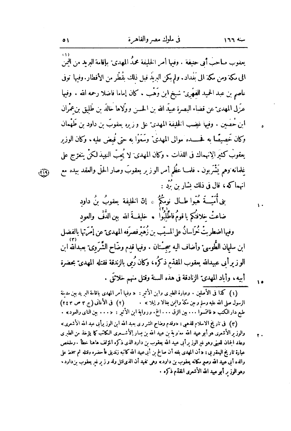 يعقوب صاحب أبي حنيفة. وفيها أمر الخليفة محمد المهدي بإقامة البريد من اليمن «1» إلى مكة ومن مكة إلى بغداد، ولم يكن البريد قبل ذلك بقطر من الأقطار. وفيها توفي عاصم بن عبد الحميد الفهري شيخ ابن وهب، كان إماماً فاضلاً رحمه الله. وفيها عزل المهدي عن قضاء البصرة عبيد الله بن الحسن وولاها خالد بن طليق بن عمران ابن حصين. وفيها غضب الخليفة المهدي على وزيره يعقوب بن داود بن طهمان وكان خصيصاً بن فحسده موالي المهدي وسعوا به حتى قبض عليه، وكان الوزير يعقوب كثير الأنهماك في اللذات، وكان المهدي لا يحب النبيذ لكن يتفرج على غلمانه وهم يشربون، فلما عظم أمر الوزير يعقوب وصار الحل والعقد بيده مع انهماكه، قال في ذلك بشار بن برد: