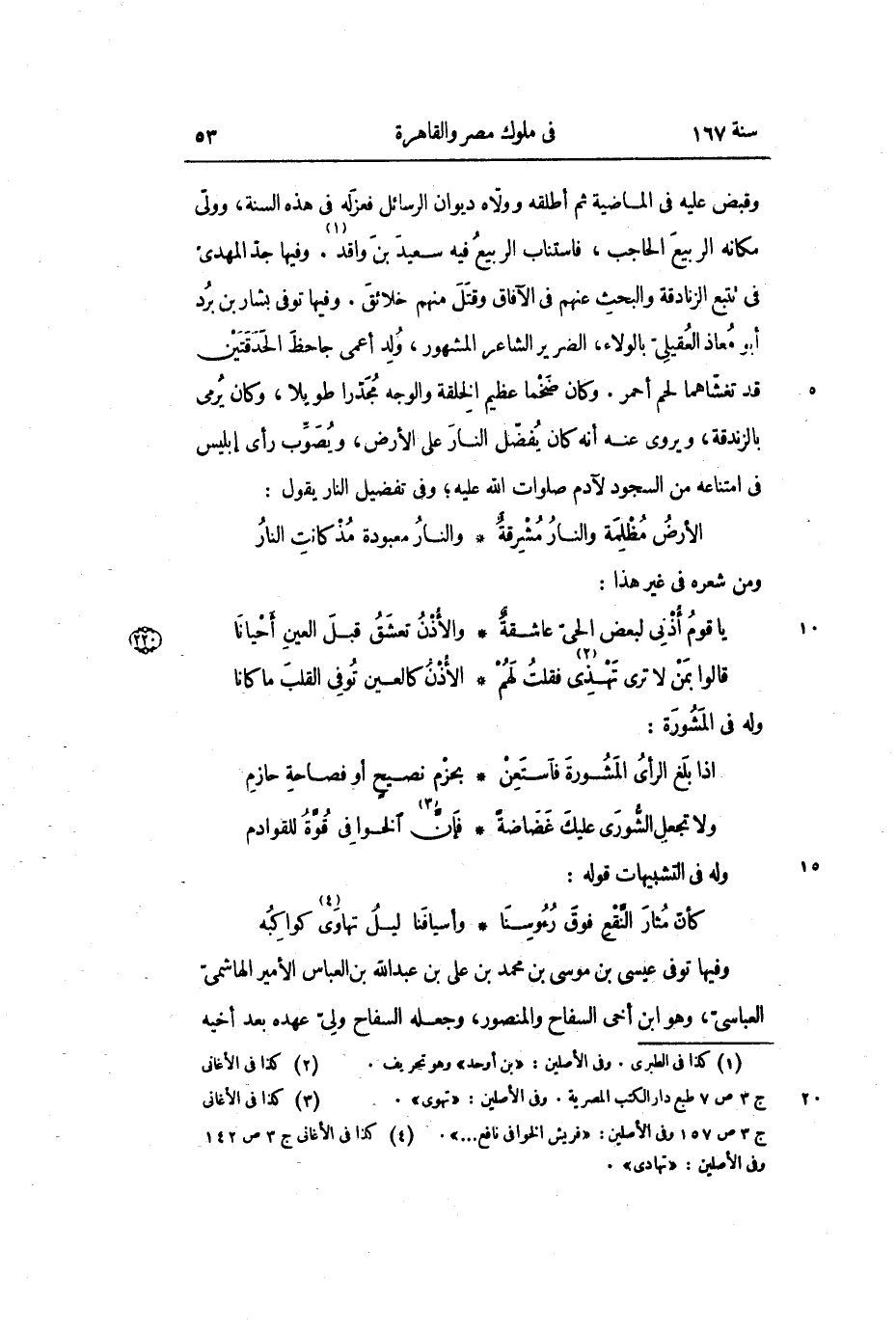 وقبض عليه في الماضية ثم أطلقه وولاه ديوان الرسائل فعزله في هذه السنة، وولى مكانه الربيع الحاجب، فاستناب الربيع فيه سعيد بن واقد «1» . وفيها جد المهدي في تتبع الزنادقة والبحث عنهم في الآفاق وقتل منهم خلائق. وفيها توفي بشار بن برد أبو معاذ العقيلي بالولاء، الضرير الشاعر المشهور، ولد أعمى جاحظ الحدقتين قد تغشاهما لحم أحمر. وكان ضخماً عظيم الخلقة والوجه مجدراً طويلا، وكان يرمى بالزندقة، ويروى عنه أنه كان يفضل النار على الأرض، ويصوب رأي إبليس في امتناعه من السجود لآدم صلوات الله عليه؛ وفى تفضيل النار يقول: