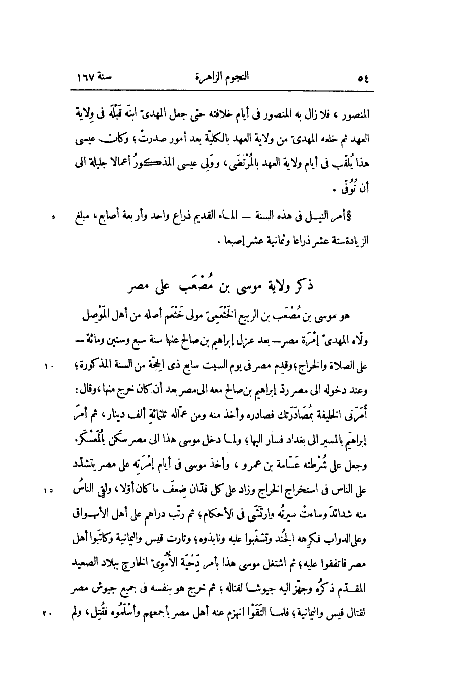 وجعل على شرطته عسامة بن عمرو، وأخذ موسى في أيام إمرته على مصر يتشدد على الناس في استخراج الخراج وزاد على كل فدان ضعف ما كان أولا، ولقي الناس منه شدائد وساءت سيرته وارتشى في الأحكام؛ ثم رتّب دراهم على أهل الأسهواق وعلى الدواب فكرهه الجند وتشغبوا عليه ونابذوه؛ وثارت قيس واليمانية وكاتبوا أهل مصر فاتفقوا عليه؛ ثم اشتغل موسى هذا بأمر دحية الأموي الخارج ببلاد الصعيد المقدم ذكره وجهز إليه جيوشا لقتاله؛ ثم خرج هو بنفسه في جميع جيوش مصر لقتال قيس واليمانية؛ فلما التقوا انهزم عنه أهل مصر بأجمعهم وأسلموه فقتل، ولم