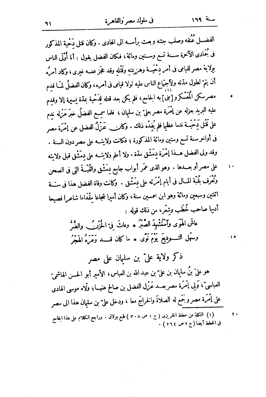 الفضل عنقه وصلب جثته وبعث برأسه إلى الهادي. وكان قتل دحية المذكور في جمادى الآخرة سنة تسع وستين ومائة، فكان الفضل يقول: أنا أولى الناس بولاية مصر لقيامي في أمر دحية وهزيمته وقتله وقد عجز عنه غيري، وكاد أمره أن يتم لطول مدته ولاجتماع الناس عليه لولا قيامي في أمره، وكان الفضل لما قدم مصر سكن المعسكر و [بنى «1» ] به الجامع، فلم يكن بعد قتله لدحية بمدة يسيرة إلا وقدم عليه البريد بعزله عن إمرة مصر بعلي بن سليمان؛ فلما سمع الفضل خبر عزله ندم على قتل دحية ندماً عظيماً فلم يفده ذلك. وكان عزل الفضل عن إمرة مصر في أواخر سنة تسع وستين ومائة المذكورة؛ فكانت ولايته على مصر دون السنة.
