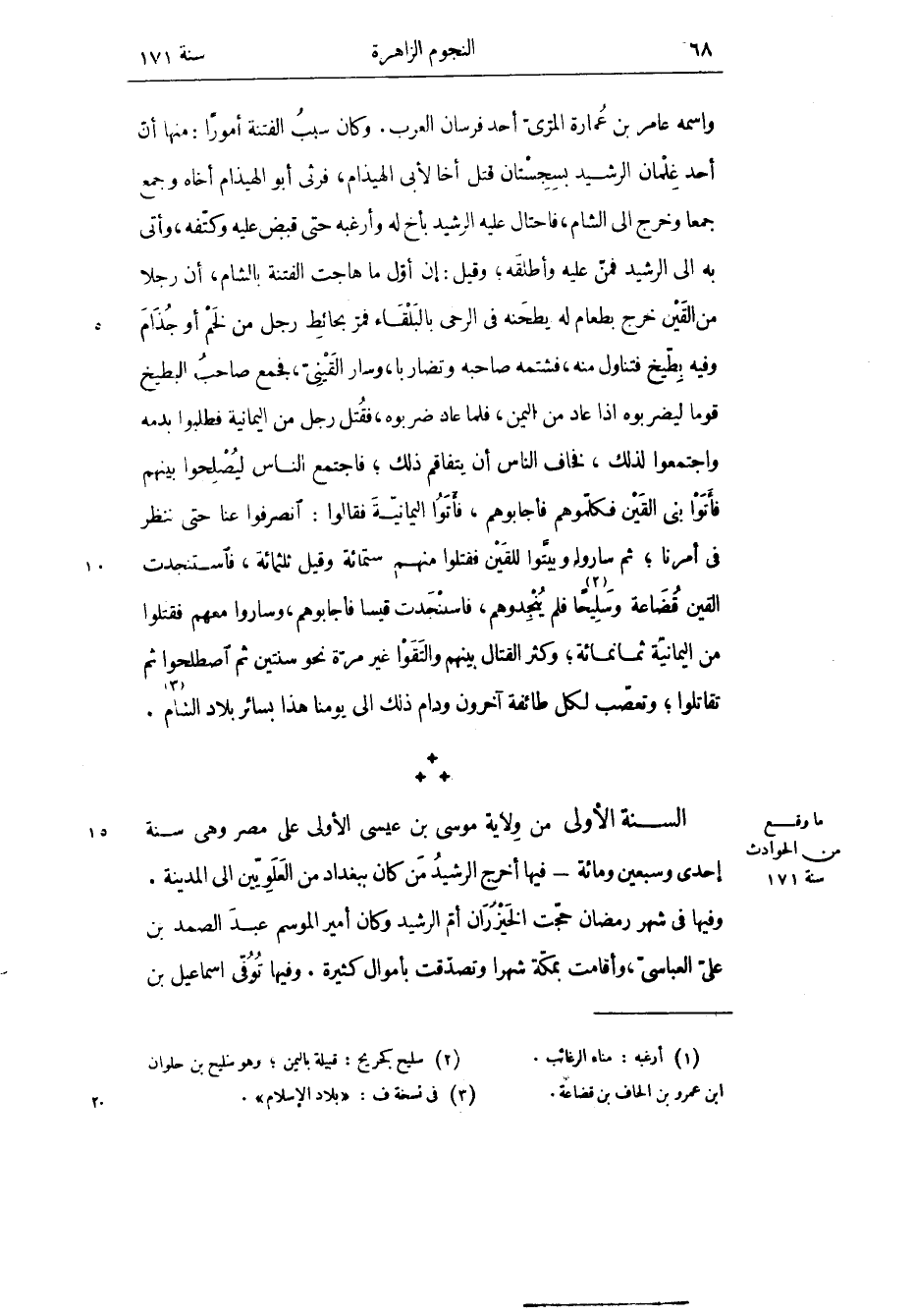 السنة الأولى من ولاية موسى بن عيسى الأولى على مصر وهي سنة إحدى وسبعين ومائة- فيها أخرج الرشيد من كان ببغداد من العلويين إلى المدينة.