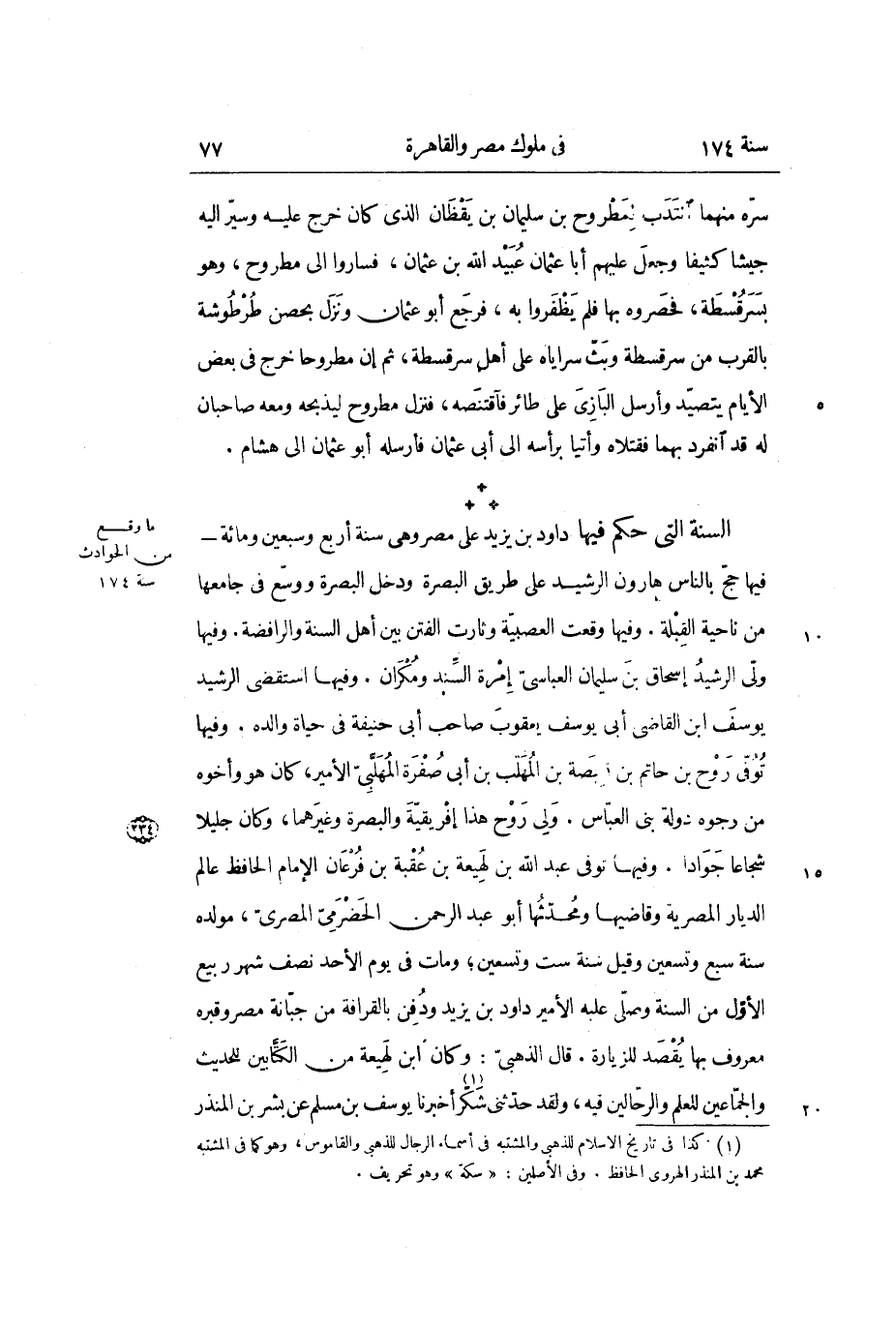 السنة التي حكم فيها داود بن يزيد على مصر وهي سنة أربع وسبعين ومائة- فيها حج بالناس هارون الرشيد على طريق البصرة ودخل البصرة ووسع في جامعها من ناحية القبلة. وفيها وقعت العصبية وثارت الفتن بين أهل السنة والرافضة. وفيها ولى الرشيد إسحاق بن سليمان العباسي إمرة السند ومكران. وفيها استقضى الرشيد يوسف ابن القاضي أبي يوسف يعقوب صاحب أبي حنيفة في حياة والده. وفيها توفي روح بن حاتم بن؟؟؟ صة بن المهلب بن أبي صفرة المهلبي الأمير، كان هو وأخوه من وجوه دولة بني العباس. ولي روح هذا إفريقية والبصرة وغيرهما، وكان جليلاً شجاعاً جواداً. وفيها توفي عبد الله بن لهيعة بن عقبة بن فرعان الإمام الحافظ عالم الديار المصرية وقاضيها ومحدثها أبو عبد الرحمن الحضرمىّ المصري، مولده سنة سبع وتسعين وقيل سنة ست وتسعين؛ ومات في يوم الأحد نصف شهر ربيع الأول من السنة وصلى عليه الأمير داود بن يزيد ودفن بالقرافة من جبّانة مصر وقبره معروف بها يقصد للزيارة. قال الذهبي: وكان ابن لهيعة من الكتابين للحديث والجماعين للعلم والرحالين فيه، ولقد حدثني شكر «1» أخبرنا يوسف بن مسلم عن بشر بن المنذر