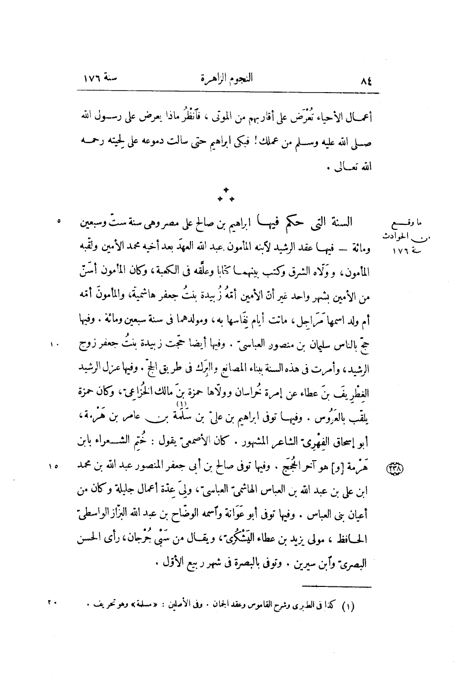 السنة التي حكم فيها إبراهيم بن صالح على مصر وهي سنة ست وسبعين ومائة- فيها عقد الرشيد لابنه المأمون عبد الله العهد بعد أخيه محمد الأمين ولقبه المأمون، وولاه الشرق وكتب بينهما كتاباً وعلقه في الكعبة، وكان المأمون أسن من الأمين بشهر واحد غير أنّ الأمين أمّه زبيدة بنت جعفر هاشميّة، والمأمون أمّه أم ولد اسمها مراجل، ماتت أيام نفاسها به، ومولدهما في سنة سبعين ومائة. وفيها حج بالناس سليمان بن منصور العباسي. وفيها أيضاً حجت زبيدة بنت جعفر زوج الرشيد، وأمرت في هذه السنة ببناء المصانع والبرك في طريق الحج. وفيها عزل الرشيد الغطريف بن عطاء عن إمرة خراسان وولاها حمزة بن مالك الخزاعي، وكان حمزة يلقب بالعروس. وفيها توفي إبراهيم بن علي بن سلمة «1» بن عامر بن هرمة، أبو إسحاق الفهري الشاعر المشهور. كان الأصمعي يقول: ختم الشعراء بابن هرمة [و] هو آخر الحجج. وفيها توفي صالح بن أبي جعفر المنصور عبد الله بن محمد ابن علي بن عبد الله بن العباس الهاشمي العباسي، ولي عدة أعمال جليلة وكان من أعيان بني العباس. وفيها توفي أبو عوانة وآسمه الوضاح بن عبد الله البزاز الواسطي الحافظ، مولى يزيد بن عطاء اليشكري، ويقال من سبي جرجان، رأى الحسن البصري وابن سيرين. وتوفي بالبصرة في شهر ربيع الأول.
