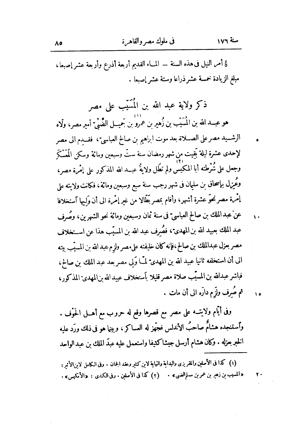 هو عبد الله بن المسيب بن زهير بن عمرو «1» بن جميل الضبي أمير مصر، ولاه الرشيد مصر على الصلاة بعد موت إبراهيم بن صالح العباسي، فقدم إلى مصر لإحدى عشرة ليلة بقيت من شهر رمضان سنة ستّ وسبعين ومائة وسكن المعسكر وجعل على شرطته أبا المكيس «2» ولم تطل ولاية عبد الله المذكور على إمرة مصر، وعزل بإسحاق بن سليمان في شهر رجب سنة سبع وسبعين ومائة، فكانت ولايته على إمرة مصر نحو عشرة أشهر، وأقام بمصر بطالاً من غير إمرة إلى أن وليها استخلافاً عن عبد الملك بن صالح العباسي في سنة ثمان وسبعين ومائة نحو الشهرين، وصرف عبد الملك بعبيد الله بن المهدي، فصرف عبد الله بن المسيب هذا عن استخلاف مصر بعزل عبد الملك بن صالح، فإنه كان خليفته على مصر ولزم عبد الله بن المسيب بيته إلى أن استخلفه ثانياً عبيد الله بن المهدي لما ولي مصر بعد عبد الملك بن صالح، فباشر عبد الله بن المسيب صلاة مصر قليلاً باستخلاف عبيد الله بن المهدي المذكور، ثم صرف ولزم داره إلى أن مات.