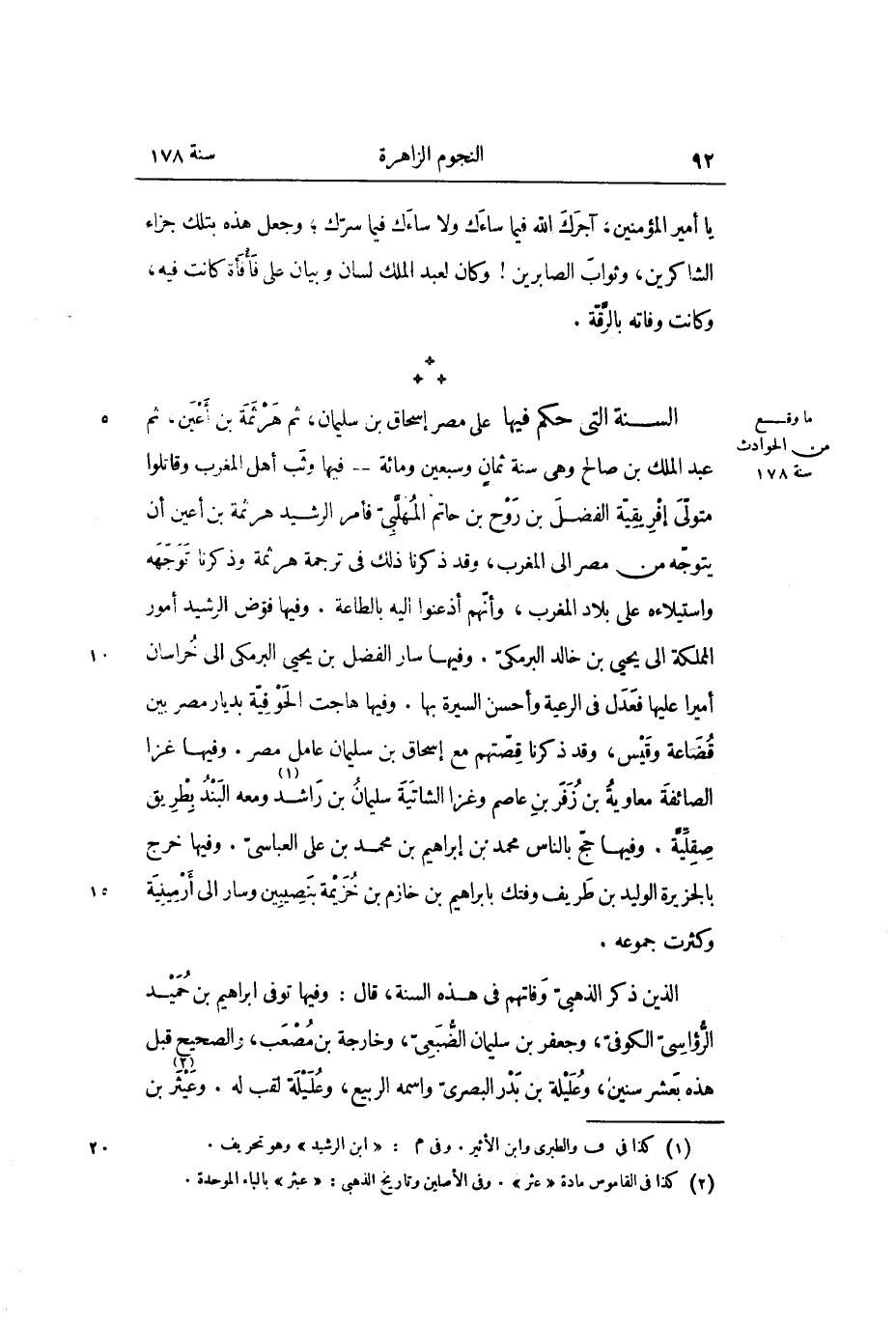 السنة التى حكم فيها على مصر إسحاق بن سليمان، ثم هرثمة بن أعين، ثم عبد الملك بن صالح وهي سنة ثمان وسبعين ومائة- فيها وثب أهل المغرب وقاتلوا متولي إفريقية الفضل بن روح بن حاتم المهلبي فأمر الرشيد هرثمة بن أعين أن يتوجه من مصر إلى المغرب، وقد ذكرنا ذلك في ترجمة هرثمة وذكرنا توجهه واستيلاءه على بلاد المغرب، وأنهم أذعنوا إليه بالطاعة. وفيها فوض الرشيد أمور المملكة إلى يحيى بن خالد البرمكي. وفيها سار الفضل بن يحيى البرمكي إلى خراسان أميراً عليها فعدل في الرعية وأحسن السيرة بها. وفيها هاجت الحوفية بديار مصر بين قضاعة وقيس، وقد ذكرنا قصتهم مع إسحاق بن سليمان عامل مصر. وفيها غزا الصائفة معاوية بن زفر بن عاصم وغزا الشاتية سليمان بن راشد «1» ومعه البند بطريق صقلّيّة. وفيها حج بالناس محمد بن إبراهيم بن محمد بن علي العباسي. وفيها خرج بالجزيرة الوليد بن طريف وفتك بإبراهيم بن خازم بن خزيمة بنصيبين وسار إلى أرمينية وكثرت جموعه.