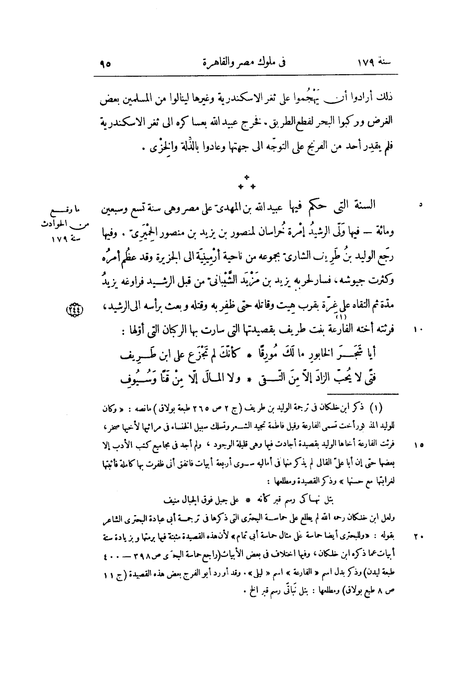 السنة التي حكم فيها عبيد الله بن المهدي على مصر وهي سنة تسع وسبعين ومائة- فيها ولى الرشيد إمرة خراسان لمنصور بن يزيد بن منصور الحميري. وفيها رجع الوليد بن طريف الشاري بجموعه من ناحية أرمينية إلى الجزيرة وقد عظم أمره وكثرت جيوشه، فسار لحربه يزيد بن مزيد الشيباني من قبل الرشيد فراوغه يزيد مدّة ثم التقاه على غرة بقرب هيت وقاتله حتى ظفر به وقتله وبعث برأسه إلى الرشيد، فرثته أخته الفارعة «1» بنت طريف بقصيدتها التى سارت بها الركبان التى أوّلها: