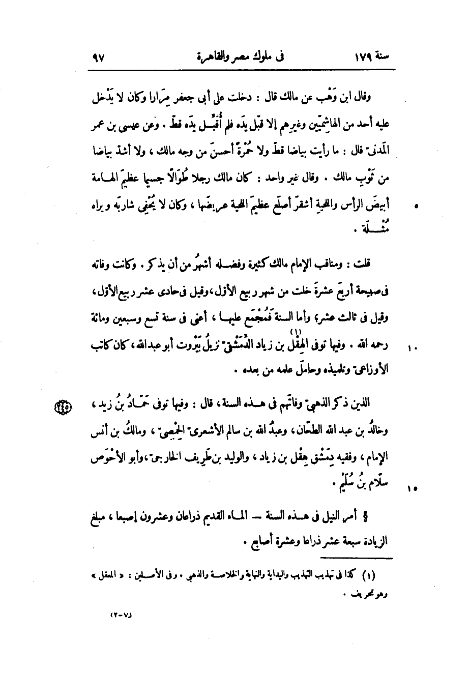 قلت: ومناقب الإمام مالك كثيرة وفضله أشهر من أن يذكر. وكانت وفاته في صبيحة أربع عشرة خلت من شهر ربيع الأول، وقيل في حادي عشر ربيع الأول، وقيل في ثالث عشر؛ وأما السنة فمجمع عليها، أعنى فى سنة تسع وسبعين ومائة رحمه الله. وفيها توفي الهقل «1» بن زياد الدّمشقىّ نزيل بيروت أبو عبد الله، كان كاتب الأوزاعي وتلميذه وحامل علمه من بعده.
