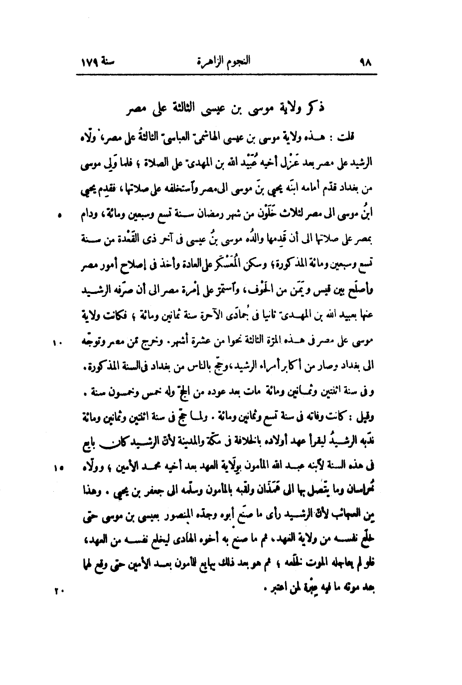 قلت: هذه ولاية موسى بن عيسى الهاشمي العباسي الثالثة على مصر، ولاه الرشيد على مصر بعد عزل أخيه عبيد الله بن المهدي على الصلاة؛ فلما ولي موسى من بغداد قدم أمامه ابنه يحيى بن موسى إلى مصر واستخلفه على صلاتها، فقدم يحيى ابن موسى إلى مصر لثلاث خلون من شهر رمضان سنة تسع وسبعين ومائة، ودام بمصر على صلاتها إلى أن قدمها والده موسى بن عيسى في آخر ذي القعدة من سنة تسع وسبعين ومائة المذكورة؛ وسكن المعسكر على العادة وأخذ في إصلاح أمور مصر وأصلح بين قيس ويمن من الحوف، واستمر على إمرة مصر إلى أن صرفه الرشيد عنها بعبيد الله بن المهدي ثانياً في جمادى الآخرة سنة ثمانين ومائة؛ فكانت ولاية موسى على مصر في هذه المرة الثالثة نحوا من عشرة أشهر. وخرج من مصر وتوجه إلى بغداد وصار من أكابر أمراء الرشيد، وحجّ بالناس من بغداد في السنة المذكورة.