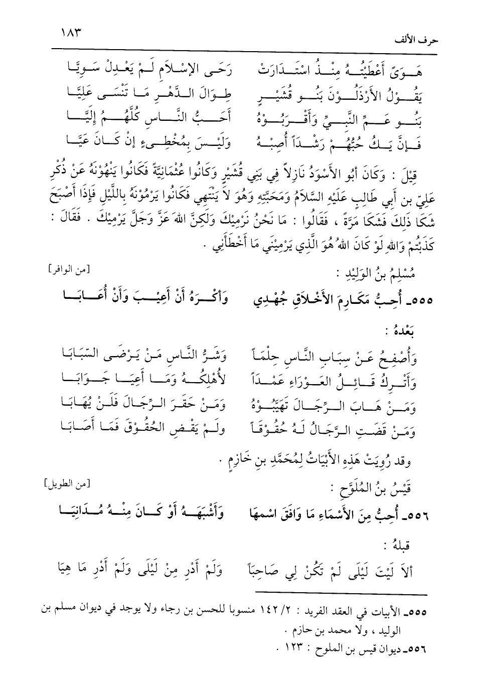 555 - الأبيات في العقد الفريد: 2/ 142 منسوبا للحسن بن رجاء ولا يوجد في ديوان مسلم بن الوليد، ولا محمد بن حازم.