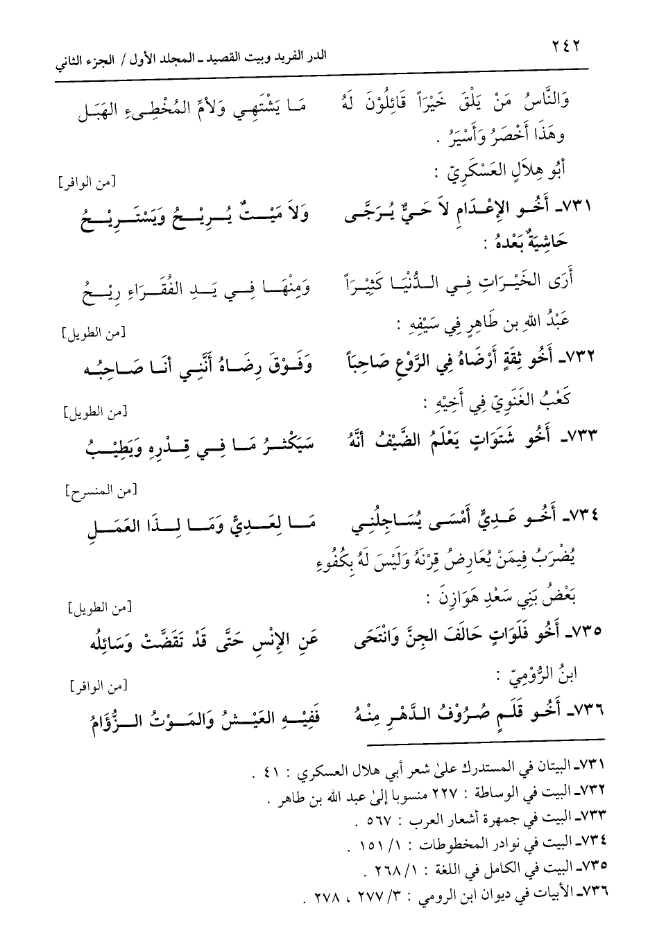 732 - البيت في الوساطة: 227 منسوبا إلى عبد اللَّه بن طاهر.