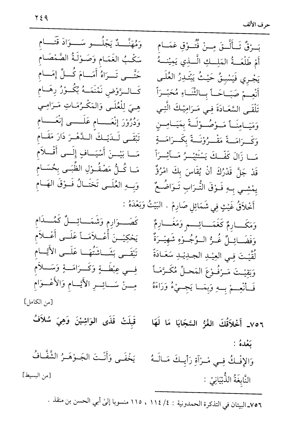 756 - أَخْلَاقُكَ الغُرُّ السَّجَايَا مَا لَهَا ... قَبِلَتْ قَذَى الوَاشِيْنَ وَهِيَ سُلَافُ