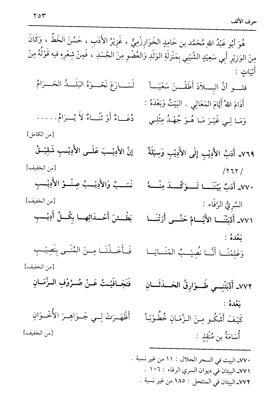 770 - أَدَبٌ بَيْنَنَا تَوَكَّدَ مِنْهُ ... نَسَبٌ وَالأَدِيْبُ صِنْوُ الأَدِيْبِ