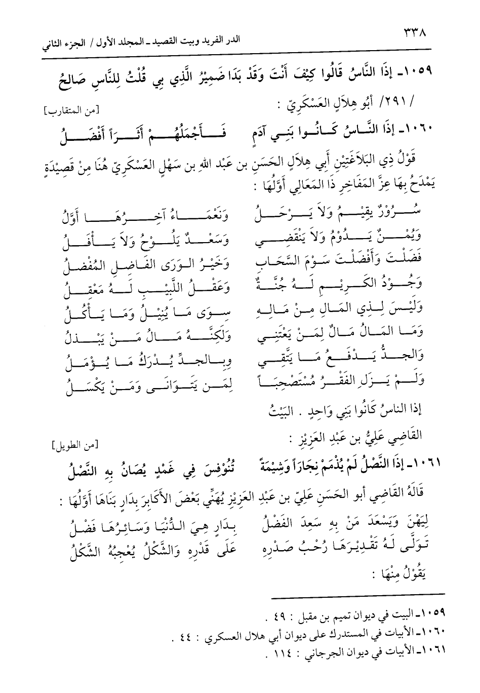قَوْلُ ذِي البَلَاغَتِيْنِ أَبِي هِلَالٍ الحَسَنِ بن عَبْد اللَّهِ بن سَهْلٍ العَسْكَرِيّ هُنَا مِنْ قَصيْدَةِ يَمْدَحُ بِهَا عِزَّ المَفَاخِرِ ذَا المَعَالِي أَوَّلُهَا: