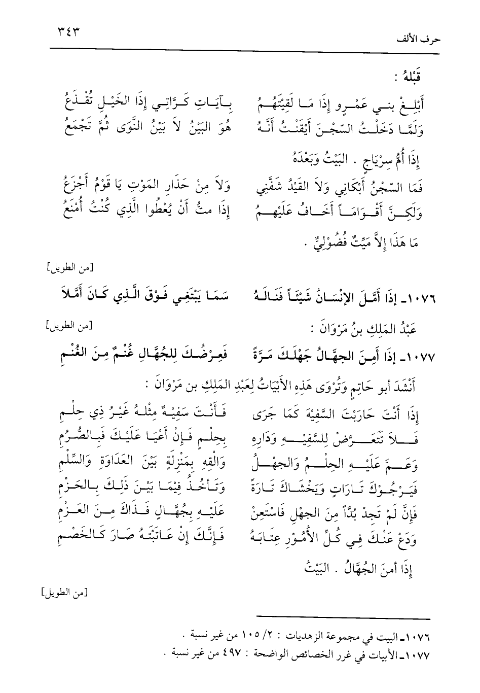 أَنْشَدَ أبو حَاتِمٍ وَتُرْوَى هَذِهِ الأَبْيَاتُ لِعَبْدِ المَلِكِ بن مَرْوَانَ: