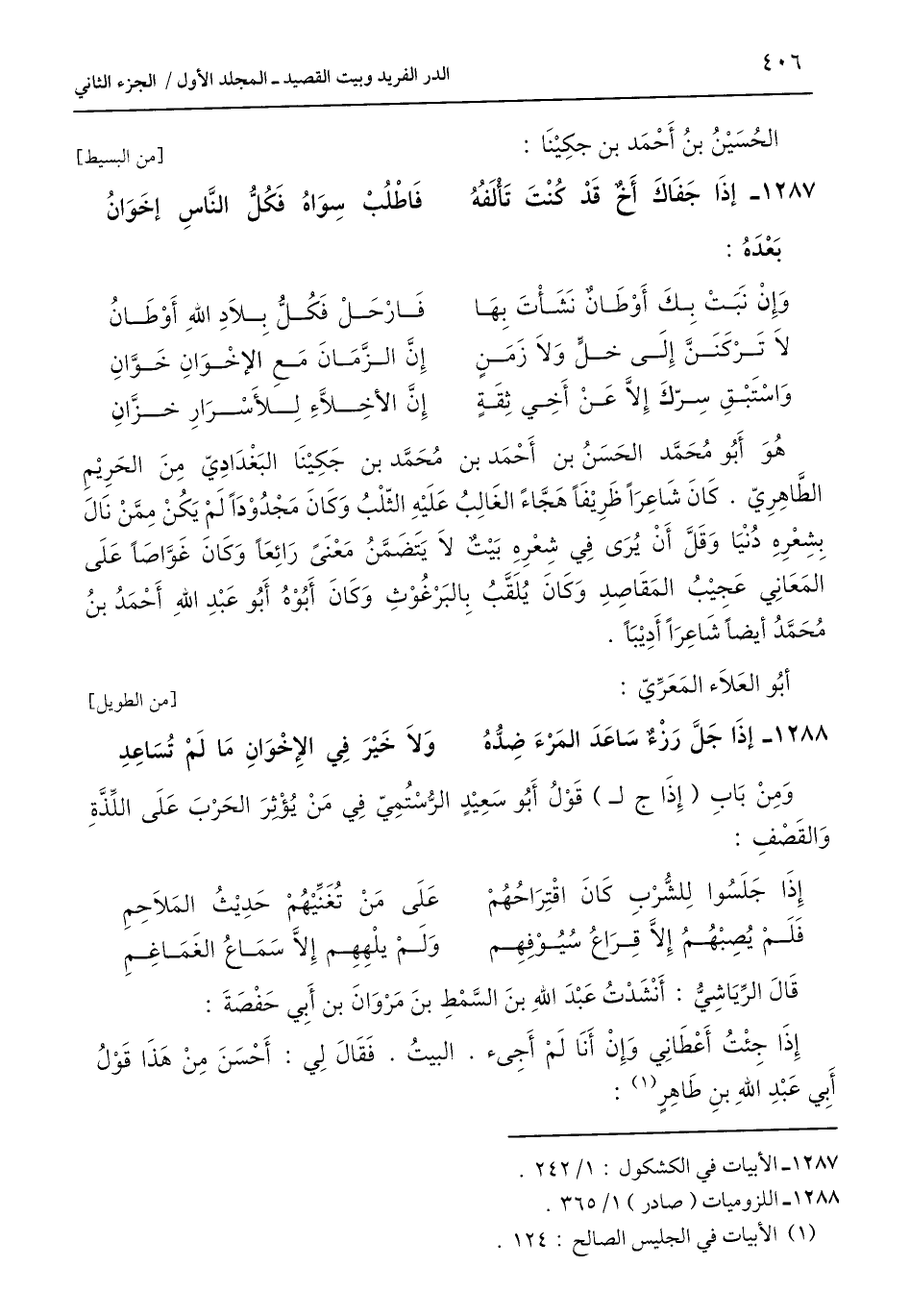 1288 - إِذَا جَلَّ رَزْءٌ سَاعَدَ المَرْءَ ضِدُّهُ ... وَلَا خَيْرَ فِي الإِخْوَانِ مَا لَمْ تُسَاعِدِ