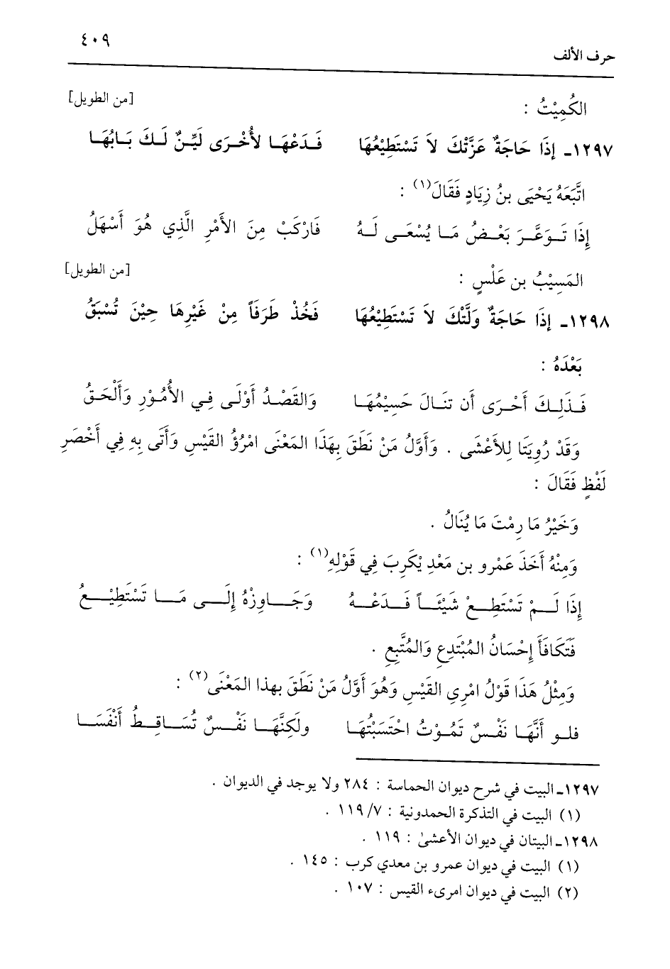 1298 - إِذَا حَاجَةٌ وَلَّتْكَ لَا تَسْتَطِيْعُهَا ... فَخُذْ طَرَفًا مِنْ غَيْرِهَا حِيْنَ تُسْبَقُ