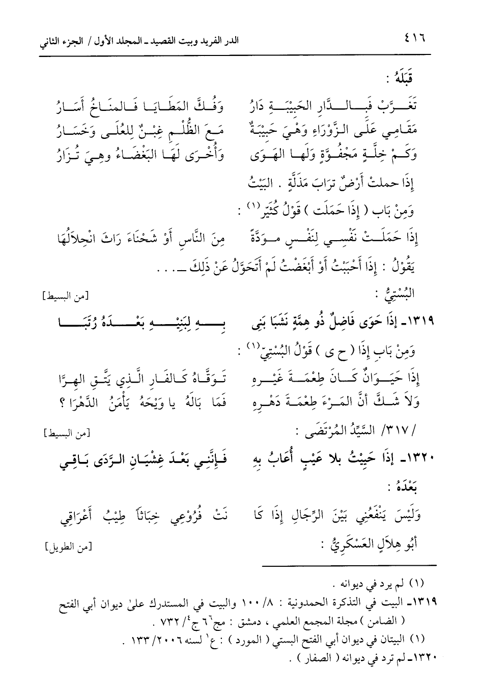 1319 - البيت في التذكرة الحمدونية: 8/ 100 والبيت في المستدرك على ديوان أبي الفتح (الضامن) مجلة المجمع العلمي، دمشق: مج 66 ج 4/ 732.