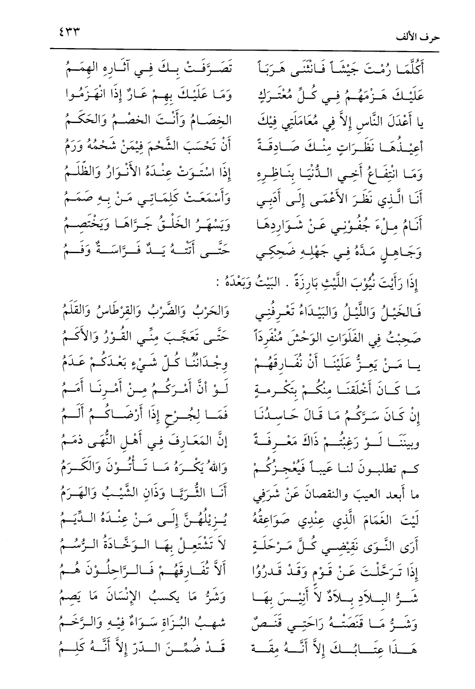 صَحِبْتُ فِي الفَلَوَاتِ الوَحْشَ مُنْفَرِدًا ... حَتَّى تَعَجَّبَ مِنِّي القُوْرُ وَالأَكَمُ