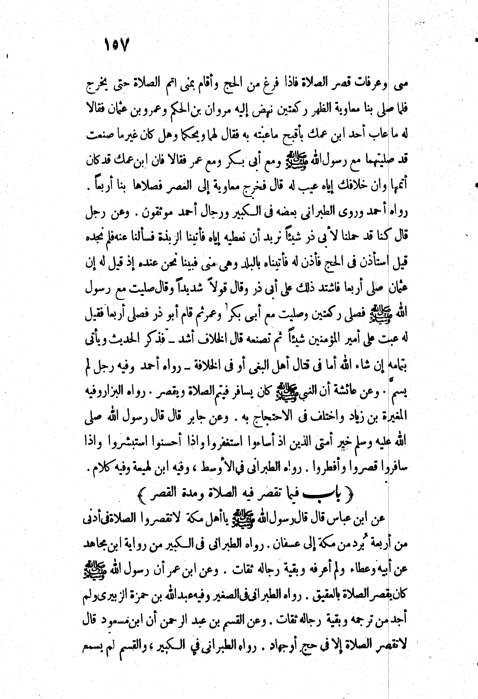 مِنًى وَعَرَفَاتٍ قَصَرَ الصَّلَاةَ، فَإِذَا فَرَغَ مِنَ الْحَجِّ وَأَقَامَ بِمِنًى أَتَمَّ الصَّلَاةَ حَتَّى يَخْرُجَ فَلَمَّا صَلَّى بِنَا مُعَاوِيَةُ الظُّهْرَ رَكْعَتَيْنِ نَهَضَ إِلَيْهِ مَرْوَانُ بْنُ الْحَكَمِ وَعَمْرُو بْنُ عُثْمَانَ فَقَالَا لَهُ: مَا عَابَ أَحَدٌ ابْنَ عَمِّكَ بِأَقْبَحَ مَا عِبْتَهُ بِهِ فَقَالَ لَهُمَا: وَيَحَكُمَا!! وَهَلْ كَانَ غَيْرُ مَا صَنَعْتُ؟ قَدْ صَلَّيْتُهُمَا مَعَ رَسُولِ اللَّهِ - صَلَّى اللَّهُ عَلَيْهِ وَسَلَّمَ - وَمَعَ أَبِي بَكْرٍ وَمَعَ عُمَرَ فَقَالَا: فَإِنَّ ابْنَ عَمِّكَ قَدْ كَانَ أَتَمَّهَا وَإِنَّ خِلَافَكَ إِيَّاهُ عَيْبٌ لَهُ قَالَ: فَخَرَجَ مُعَاوِيَةُ إِلَى الْعَصْرِ فَصَلَّاهَا بِنَا أَرْبَعًا.